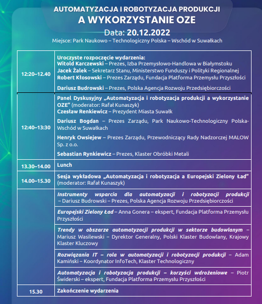 Jednym z partnerów wydarzenia, w którym uczestniczyć będą doradcy i eksperci oraz przedsiębiorcy, którzy będą dyskutować w obszarze automatyzacji i robotyzacji, instrumentów ich wsparcia, zielonego ładu, rozwiązań IT i ich roli oraz korzyści z wdrożenia, jest Izba Przemysłowo-Gospodarcza w Suwałkach.
