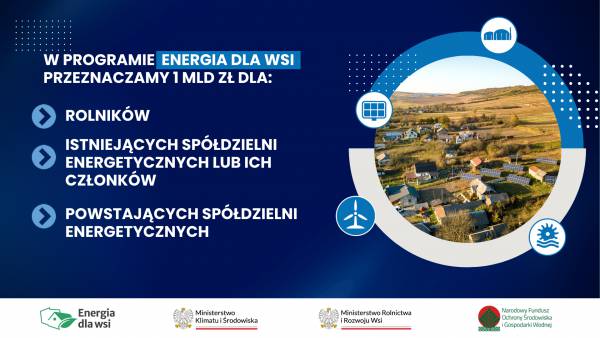 Program „Energia dla wsi” jest kontynuacją i rozszerzeniem zakończonego już naboru dla części 2) „Biogazownie i małe elektrownie wodne” programu Agroenergia. Nabory dla jego części 1) „Mikroinstalacje, pompy ciepła i towarzyszące magazyny” są nadal prowadzone przez wojewódzkie fundusze ochrony środowiska i gospodarki wodnej.
