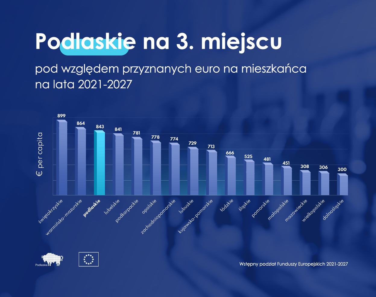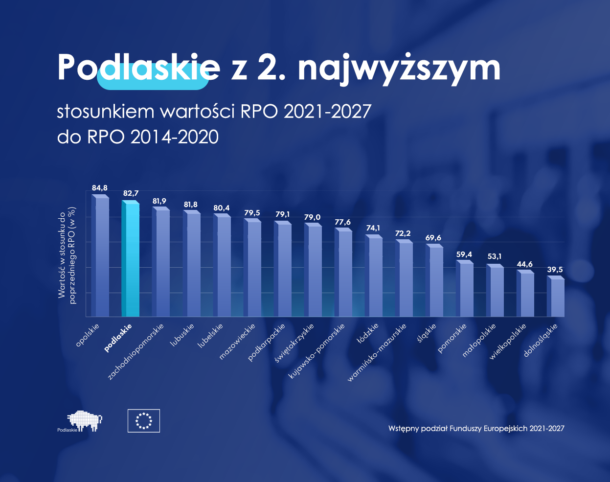 PieniÄ…dze na programy regionalne podzielono wedÅ‚ug algorytmu opartego na tych samym kryteriach, co poprzednio, miÄ™dzy innymi na liczbie ludnoÅ›ci i PKB na mieszkaÅ„ca. Województwo podlaskie ma siÄ™ czym pochwalić, ponieważ jesteÅ›my na 3. miejscu pod wzglÄ™dem euro na mieszkaÅ„ca. Województwo podlaskie plasuje siÄ™ z 2. najwyższym stosunkiem wartoÅ›ci RPO 2021-2027 do RPO 2014-2020.