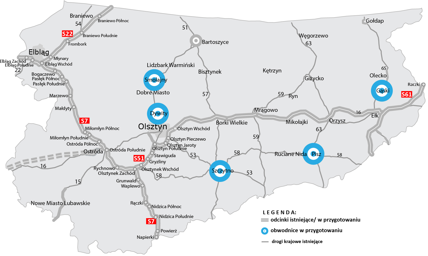 Na Warmii i Mazurach z tego programu powstanie pięć obwodnic. Najbardziej zaawansowanÄ… inwestycjÄ… jest obwodnica Smolajn w ciÄ…gu drogi krajowej nr 51. Dla tego zadania na koÅ„cowym etapie znajduje siÄ™ proces opracowywania dokumentacji. ZÅ‚ożyliÅ›my już wniosek o wydanie decyzji Å›rodowiskowej. Jeszcze w tym roku planujemy ogÅ‚osić przetarg na budowÄ™. W 2021 roku z kolei planowane jest ogÅ‚oszenie przetargu na budowÄ™ obwodnicy GÄ…sek w ciÄ…gu drogi krajowej nr 65, dla której prace przygotowawcze sÄ… również na zaawansowanym etapie – koncentrujÄ… siÄ™ na opracowaniu niezbÄ™dnej dokumentacji do uzyskania decyzji o Å›rodowiskowych uwarunkowaniach wraz z uzyskaniem tej decyzji. OgÅ‚oszenie przetargów na realizacjÄ™ pozostaÅ‚ych obwodnic przewidujemy na lata 2024-25.
