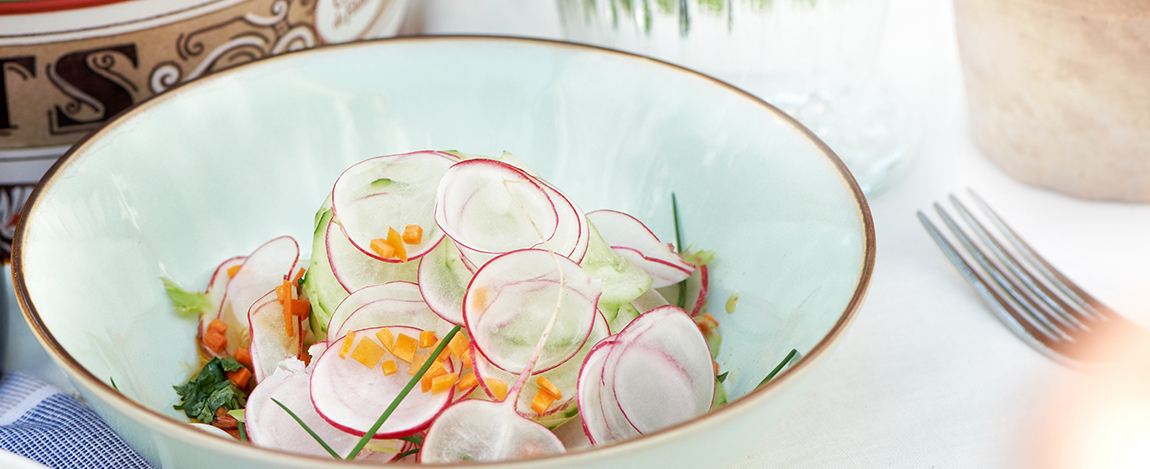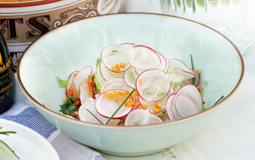SaÅ‚ata z ogórka i rzodkiewek w delikatnym dressingu na bazie sosu sojowego