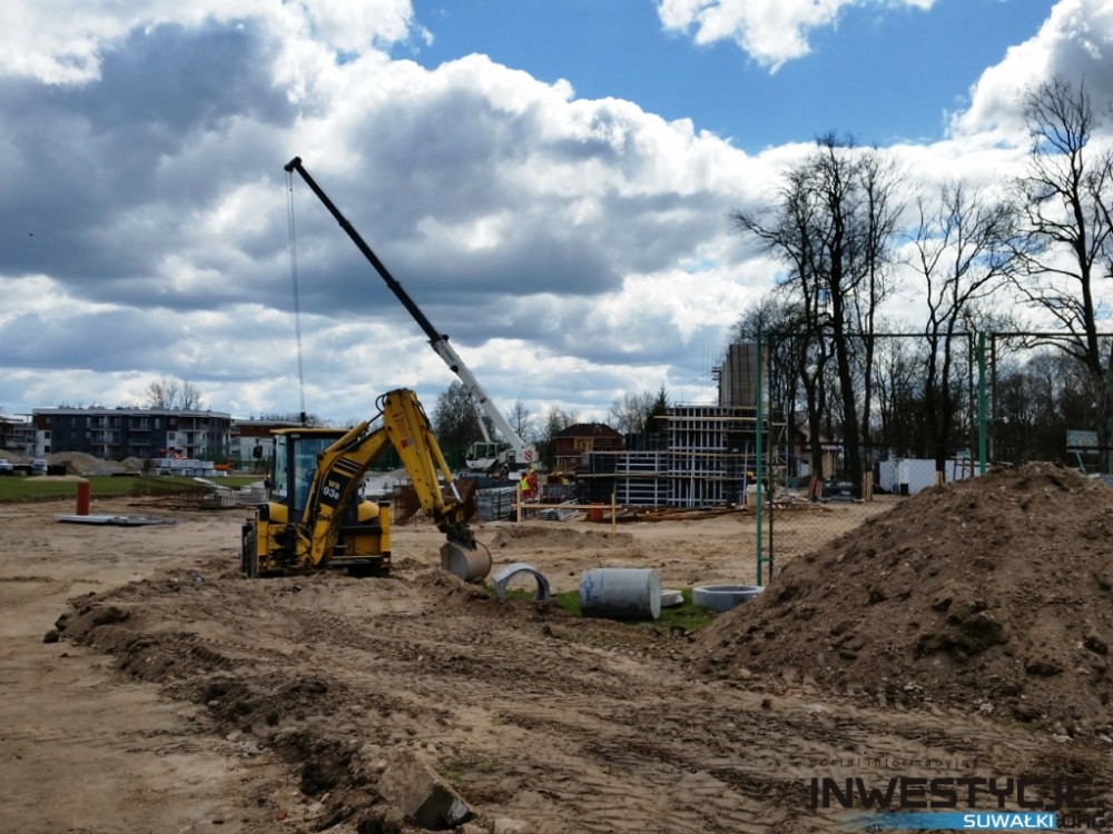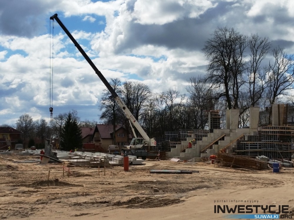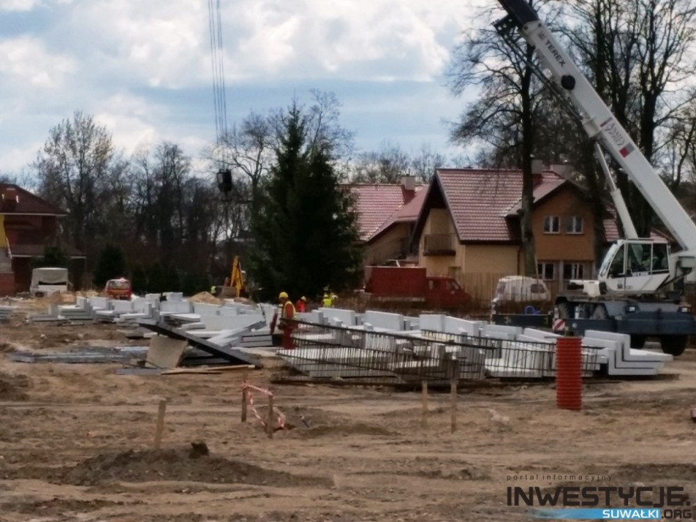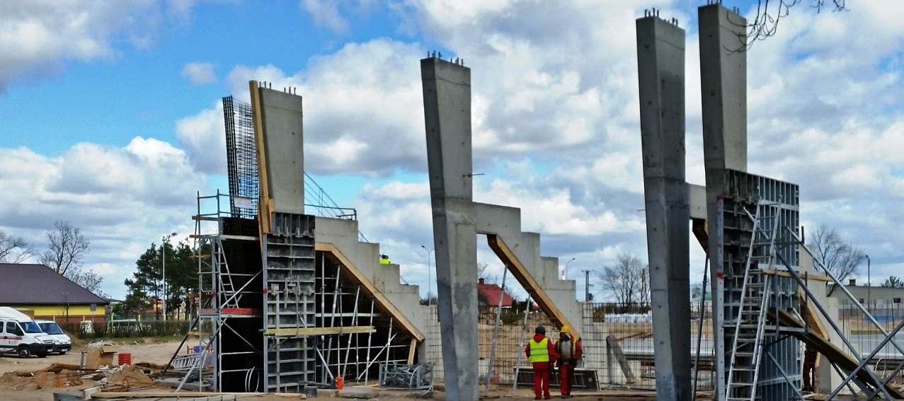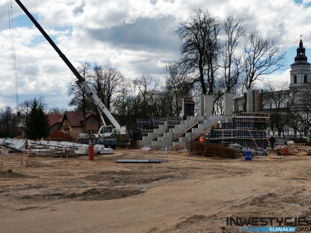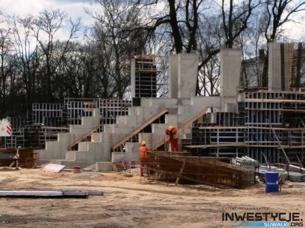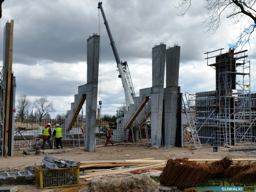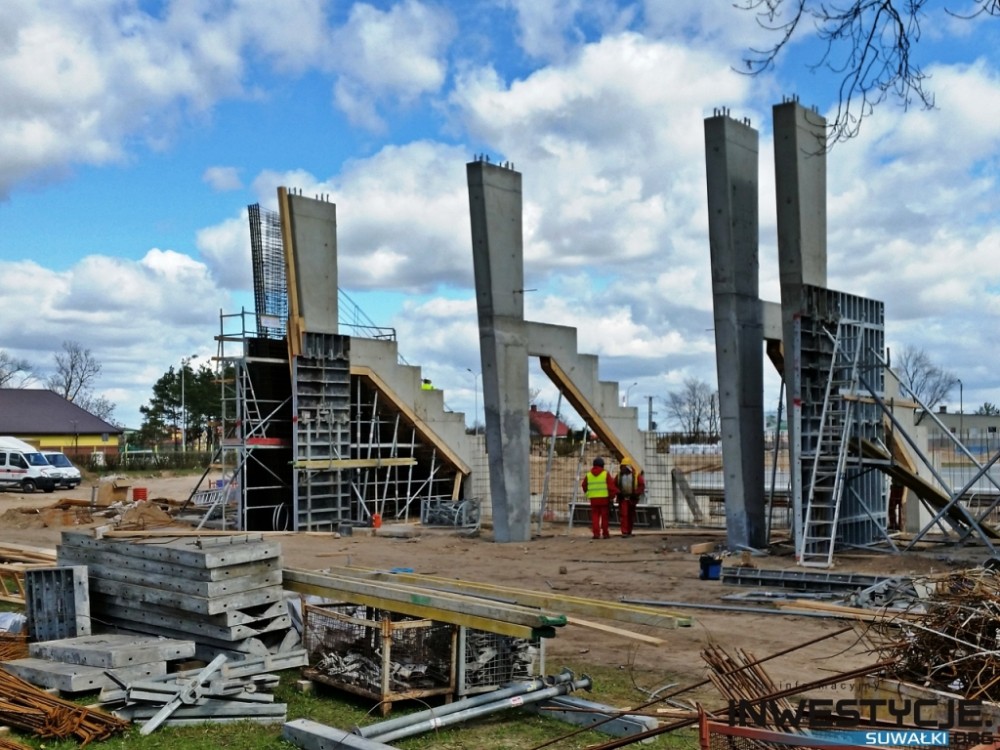 Jednak to, co na budowie przy ul. Wojska Polskiego od poczÄ…tku kwietnia najbardziej przykuwa wzrok suwalczan, to konstrukcja wznoszonej trybuny. Stawiane sÄ… wÅ‚aÅ›nie pierwsze żelbetowe sÅ‚upy i belki zÄ™bate. Jest to jeden z najbardziej spektakularnych okresów budowy. Po wykonaniu sÅ‚upów i belek zÄ™batych, czyli ukoÅ›nych elementów konstrukcji, bÄ™dzie możliwy montaż na nich stopnic. SÄ… to odpowiednio wyprofilowane pÅ‚askie betonowe elementy, które bÄ™dÄ… stanowić „podÅ‚ogÄ™” trybuny. Te elementy zostaÅ‚y już wykonane i jedynie czekajÄ… na zamontowanie w pobliżu budowanej trybuny. NastÄ™pnie na sÅ‚upach osadzone zostanÄ… stalowe dźwigary zadaszenia. Docelowo trybuna od podÅ‚oża do dźwigarów dachowych bÄ™dzie miaÅ‚a blisko 13 metrów wysokoÅ›ci. Na trybunie bÄ™dzie mogÅ‚o zasiąść 1040 osób.