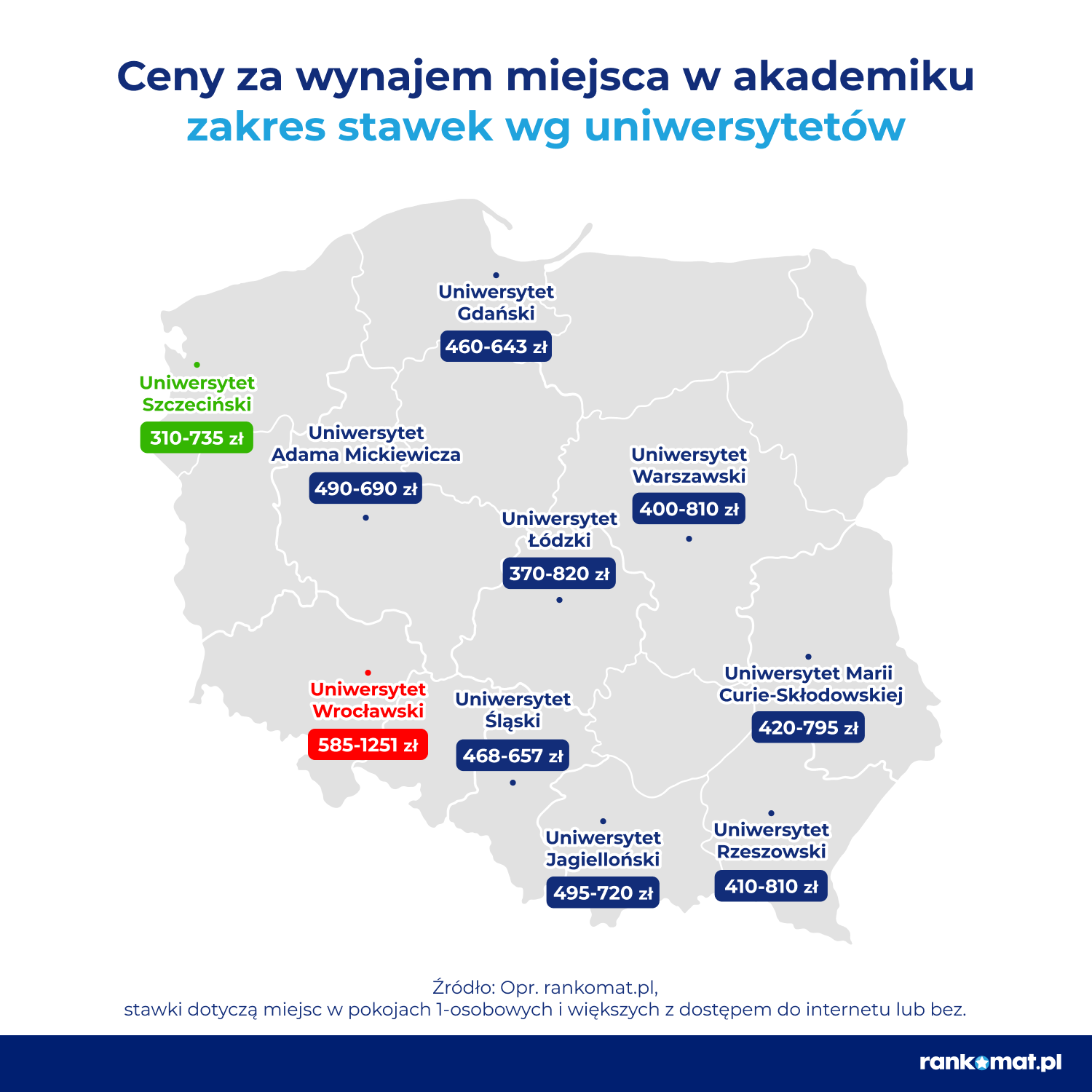 Ceny za wynajem miejsca w akademiku w 10 miastach Polski są umiarkowanie zróżnicowane. Zestawienie rankomat.pl dotyczy tylko stawek oferowanych przez uniwersytety. Najtańsze miejsce w pokoju akademickim oferuje Uniwersytet Szczeciński (310 zł miesięcznie). W Łodzi za najtańszą opcję zakwaterowania trzeba wydać co najmniej 370 zł, w Warszawie podobnie (400 zł). Niską stawkę ma jeszcze Uniwersytet Rzeszowski (410 zł), natomiast studenci Uniwersytetu Wrocławskiego muszą liczyć się z wydatkiem co najmniej 585 zł, tyle że bez dodatkowych kosztów, jak w przypadku wynajmu mieszkania.