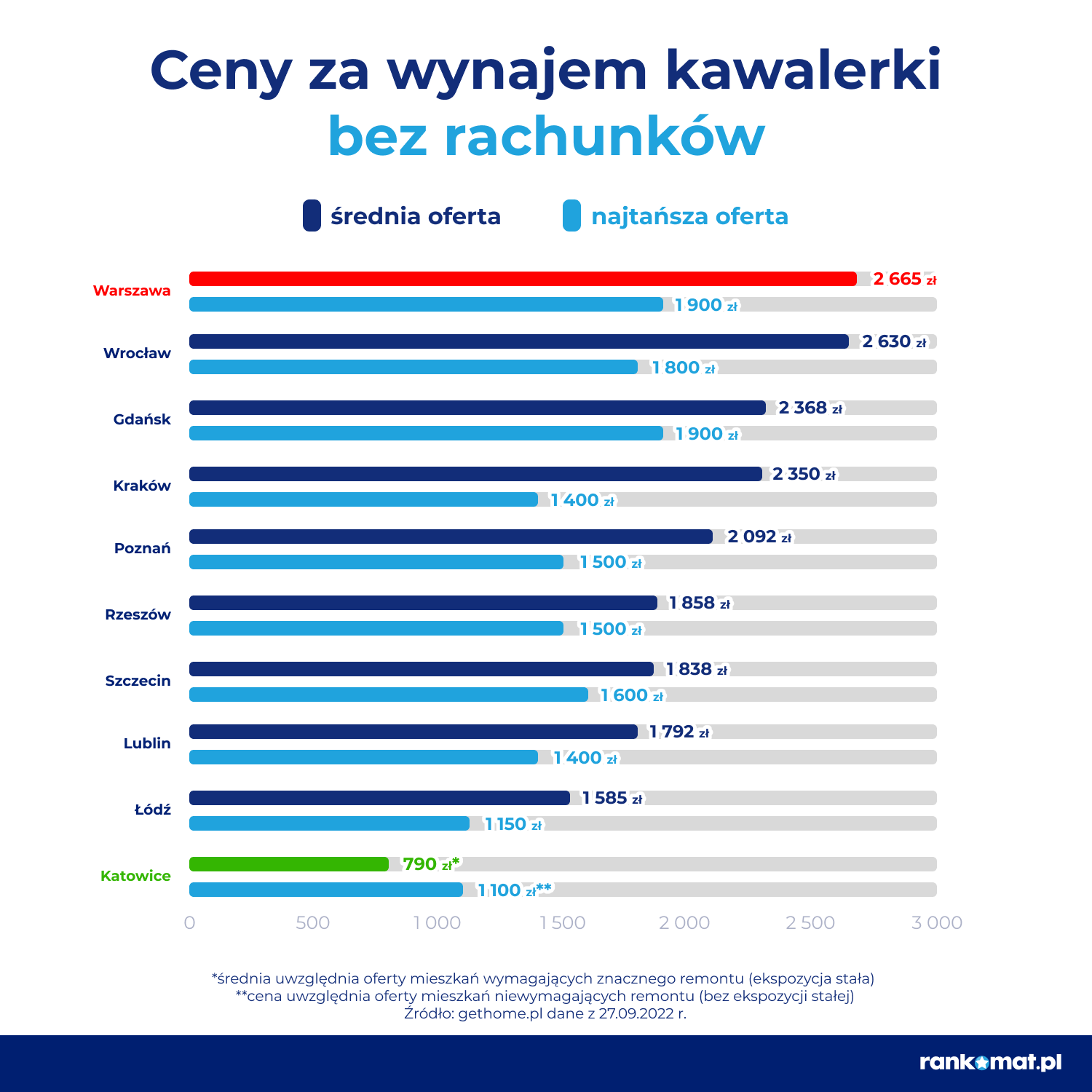 Tak wysoka dysproporcja średnich stawek bierze się ze specyfiki rynku wynajmu mieszkań w Katowicach, gdzie występują oferty kawalerek bardzo tanich, ale wymagających sporego remontu (w ogłoszeniach widnieją jako tzw. ekspozycja stała). Pomijając wyjątek Katowic, trzeba przyjąć, że za kawalerkę w dużym mieście trzeba wydać średnio 2000 zł miesięcznie samego czynszu.