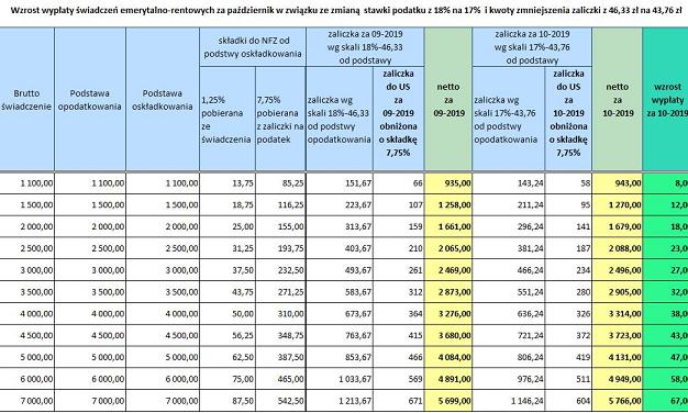 W zależności od wysokości, świadczenia ulegną zwiększeniu. Dołączona tabela przedstawia przykładowy wzrost wypłaty świadczeń emerytalno-rentowych za październik w związku ze zmiana stawki podatku z 18% na 17% i kwoty zmniejszenia zaliczki.