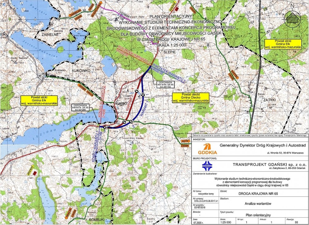 GDDKiA Proces wykonywania studium techniczno-ekonomiczno-Å›rodowiskowego z elementami koncepcji programowej (STEÅš-R – etap I) dla obwodnicy miejscowoÅ›ci GÄ…ski w ciÄ…gu drogi krajowej nr 65 wszedÅ‚ wÅ‚aÅ›nie w kluczowÄ… fazÄ™. Na poczÄ…tku sierpnia 2020 roku GDGKiA wystÄ…piÅ‚a do Burmistrza Olecka z wnioskiem o wydanie decyzji Å›rodowiskowej. Po jej uzyskaniu bÄ™dzie można przystÄ…pić do prac nad II etapem STEÅš-R (już dla wybranego wariantu). Po ich zakoÅ„czeniu konieczne bÄ™dzie ogÅ‚oszenie przetargu na realizacjÄ™ zadania w systemie „Projektuj i buduj” i uzyskanie decyzji o zezwoleniu na realizacjÄ™ inwestycji drogowej (ZRID). Budowa obwodnicy GÄ…sek przewidziana jest na lata 2022-2025.