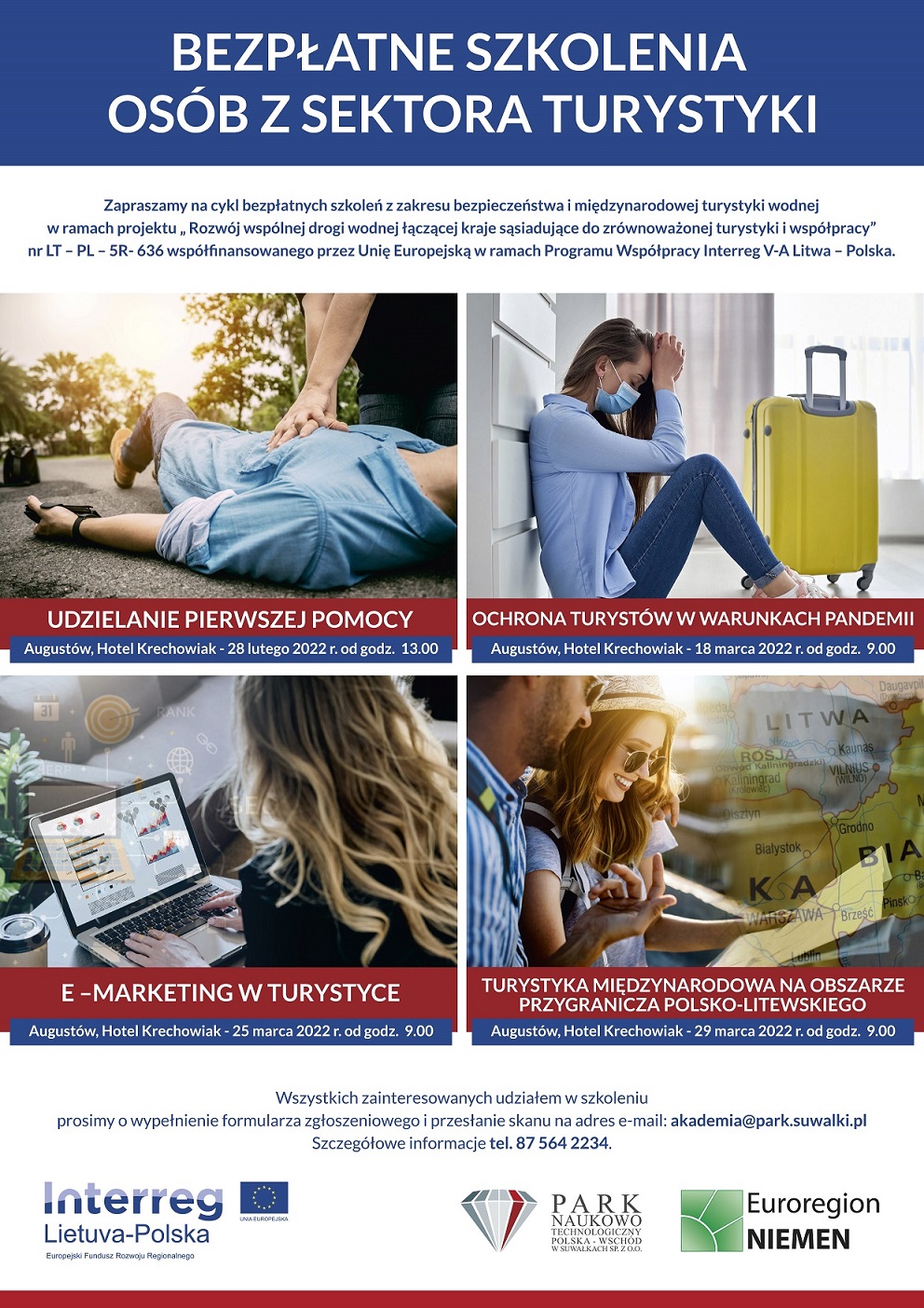 Park Naukowo-Technologiczny Polska-Wschód zapraszamy do swojej siedziby w Suwałkach oraz do Hotelu Krechowiak w Augustowie na cykl bezpłatnych szkoleń z zakresu bezpieczeństwa i międzynarodowej turystyki wodnej.