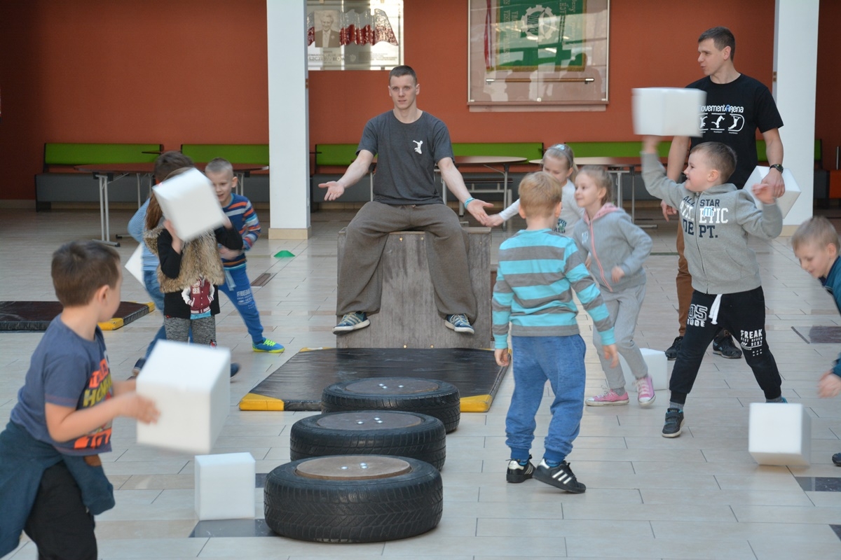 - Po zakończeniu budowy parkouru nad zalewem, w Suwałkach byłem jesze kilka razy - wspomina Tomasz Dąbrowski. Przyjeźdżaliśmy do was z Pawłem, wirtuozem pracy z dziećmi, na zaproszenia PWSZ. Dawaliśmy pokazy na Juwenaliach, prowadziliśmy akrobatyczne zajęcia na Uniwersytecie Dziecięcym PWSZ Suwałki (patrz zdjęcie poniżej).