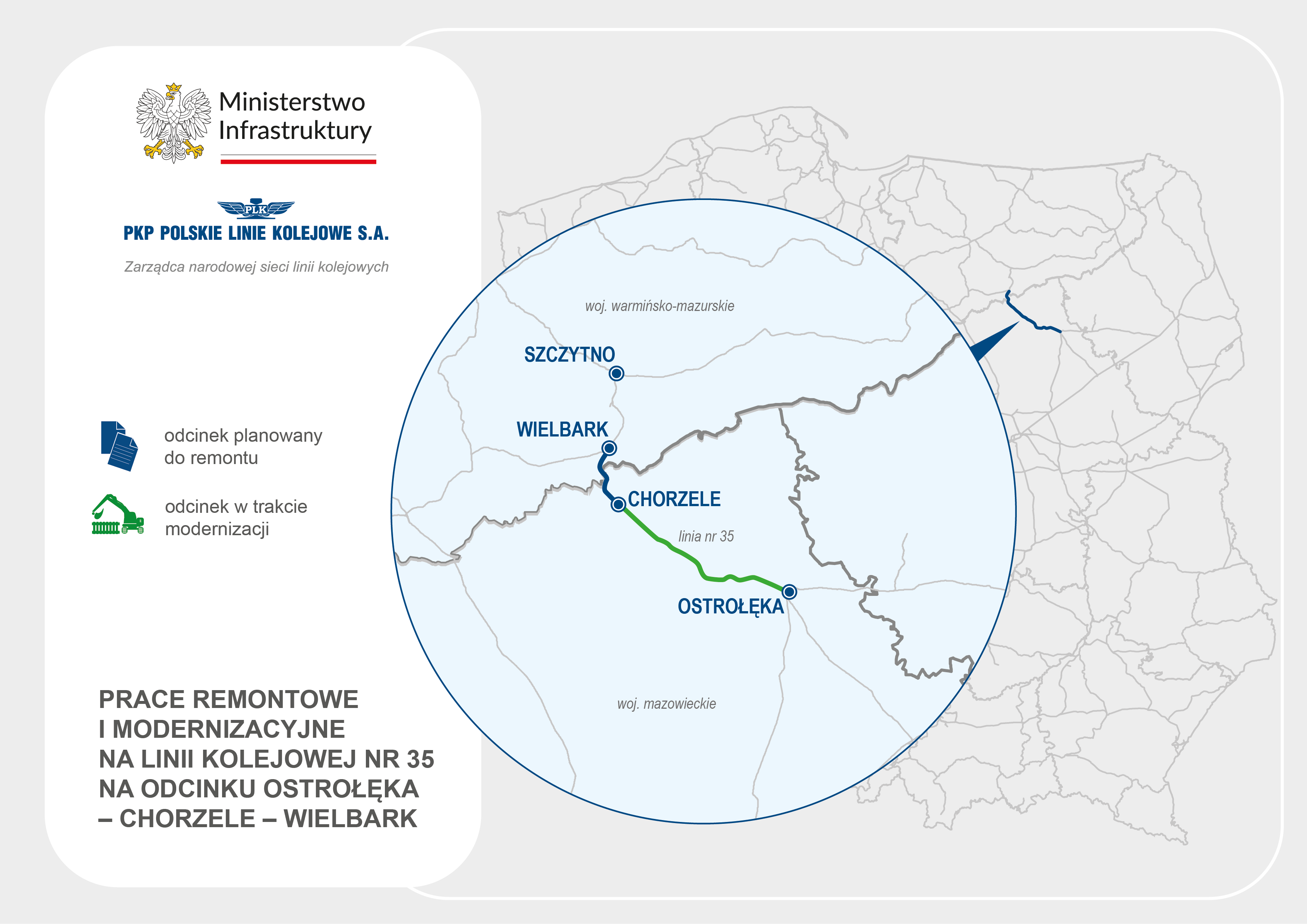 Remont trasy Wielbark – Chorzele bÄ™dzie kontynuacjÄ… realizowanych przez PLK SA prac zwiÄ…zanych z poprawÄ… dostÄ™pnoÅ›ci mieszkaÅ„ców regionu do kolei na styku województwa warmiÅ„sko-mazurskiego i mazowieckiego. PKP PLK SA przygotowaÅ‚y nowy tor do sprawnych podróży na blisko 60-kilometrowym odcinku Ostrołęka – Chorzele.
