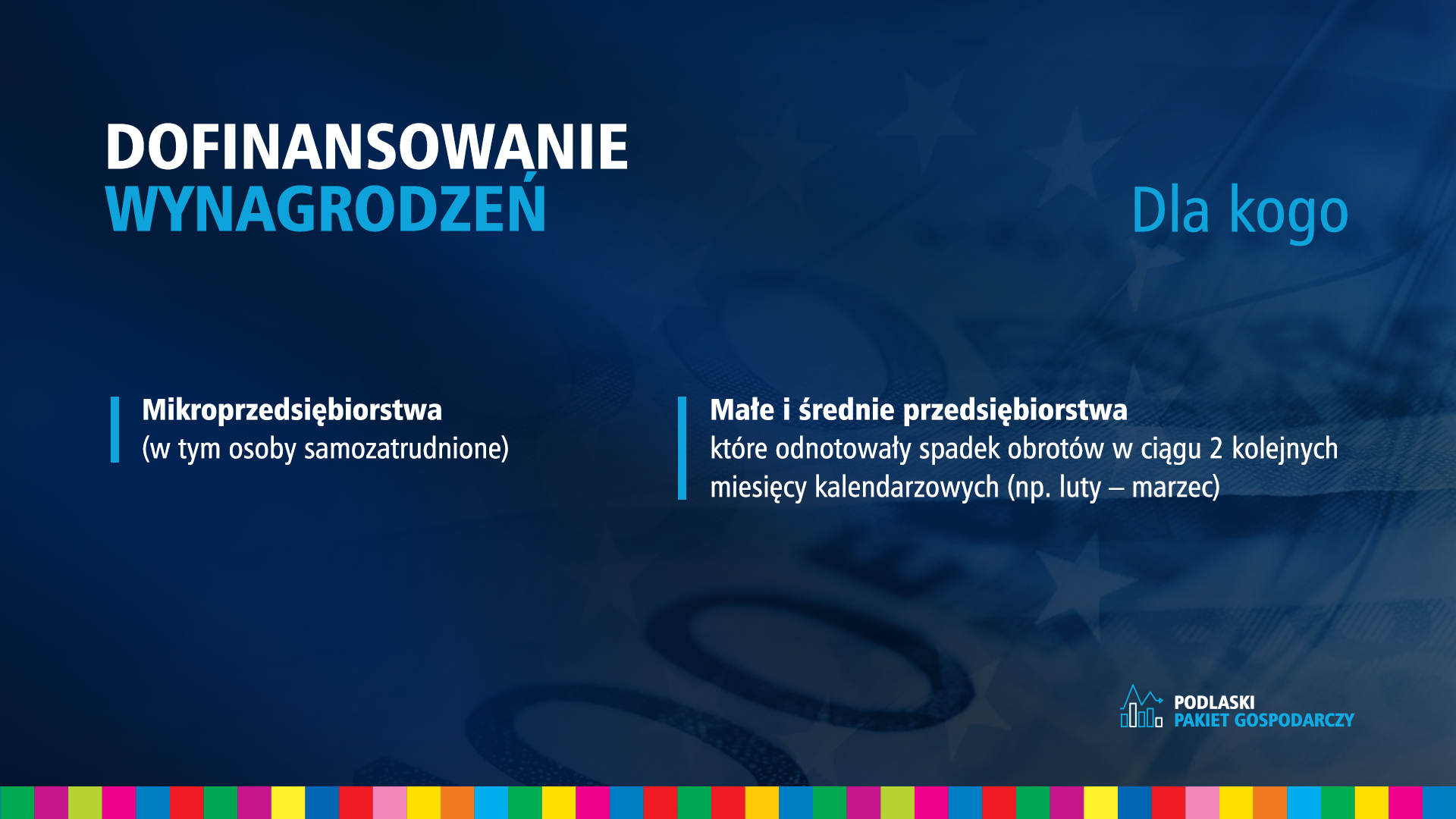 Wsparcie adresowane jest do mikro-, maÅ‚ych i Å›rednich przedsiÄ™biorców, a także do przedsiÄ™biorców bÄ™dÄ…cych osobami fizycznymi niezatrudniajÄ…cymi pracowników z województwa podlaskiego.