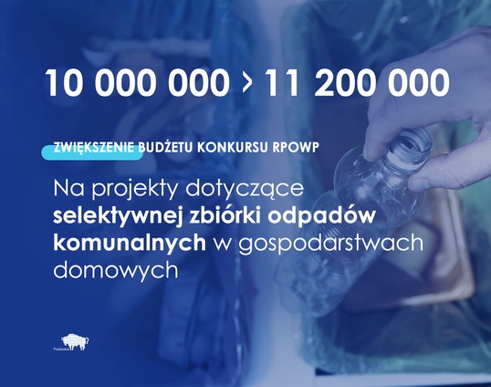 Zarząd Województwa zwiększył o 1,2 mln zł budżet konkursu w ramach Regionalnego Programu Operacyjnego Województwa Podlaskiego na projekty dotyczące selektywnej zbiórki odpadów komunalnych w gospodarstwach domowych, w tym surowców odnawialnych.