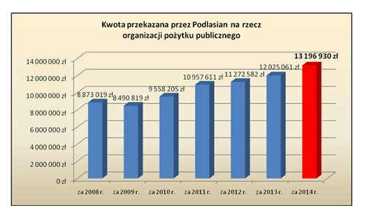 Wraz ze wzrostem liczby darczyńców, wzrosła również znacznie, bo o ponad 1 mln 171 tys. złotych kwota, którą otrzymały OPP. W zeznaniach za 2013 r. podatnicy przekazali organizacjom 12.025.061 zł, a w zeznaniach za 2014 r. było to już 13.196.930 zł. Kwoty przekazywane w ostatnich latach w woj. podlaskim na rzecz OPP porównuje poniższy wykres.