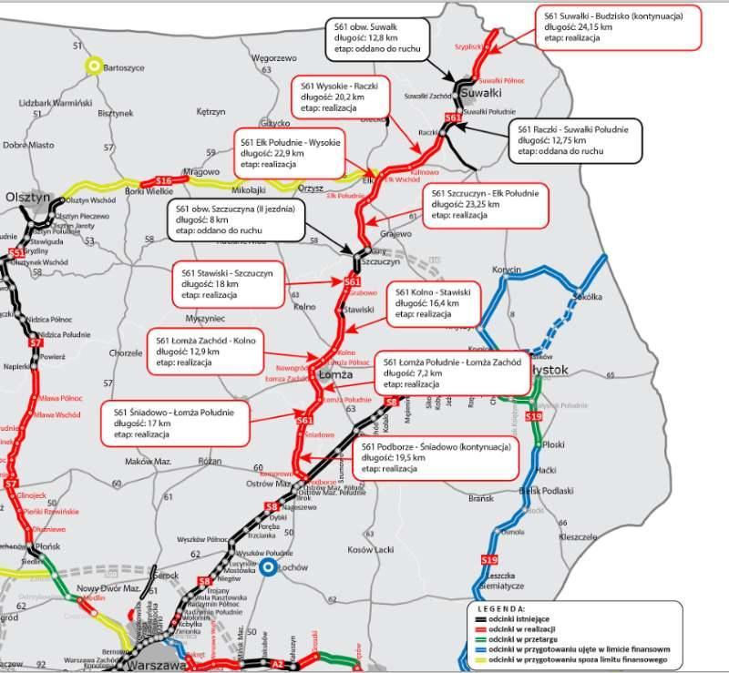 Łączna długość przyszłej S61 to ponad 214 km, z czego kierowcy już korzystają z trzech odcinków o łącznej długości ok. 33,5 km. Jako pierwszy, w listopadzie 2014 roku, został oddany odcinek Raczki – Suwałki Południe o długości ok. 12,7 km, zbudowany w ramach realizacji obwodnicy Augustowa. Od kwietnia 2019 roku kierowcy mogą korzystać z kolejnych 12,8 km, czyli obwodnicy Suwałk, a od 15 maja br. z drugiej jezdni obwodnicy Szczuczyna o długości ok. 8 km.