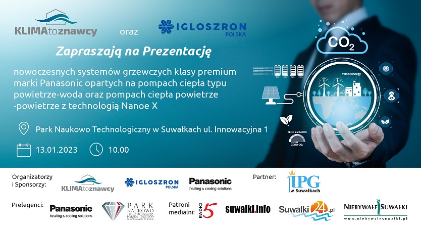 KLIMAtoznawcy i Igloszron Polska wraz z partnerem, Izbą Przemysłowo-Gospodarczą w Suwałkach zapraszają w piątek, 13 stycznia do Parku Naukowo-Technologicznego Polska-Wschód na prezentację nowoczesnych systemów grzewczych klasy premium marki Panasonic opartych na pompach ciepła.