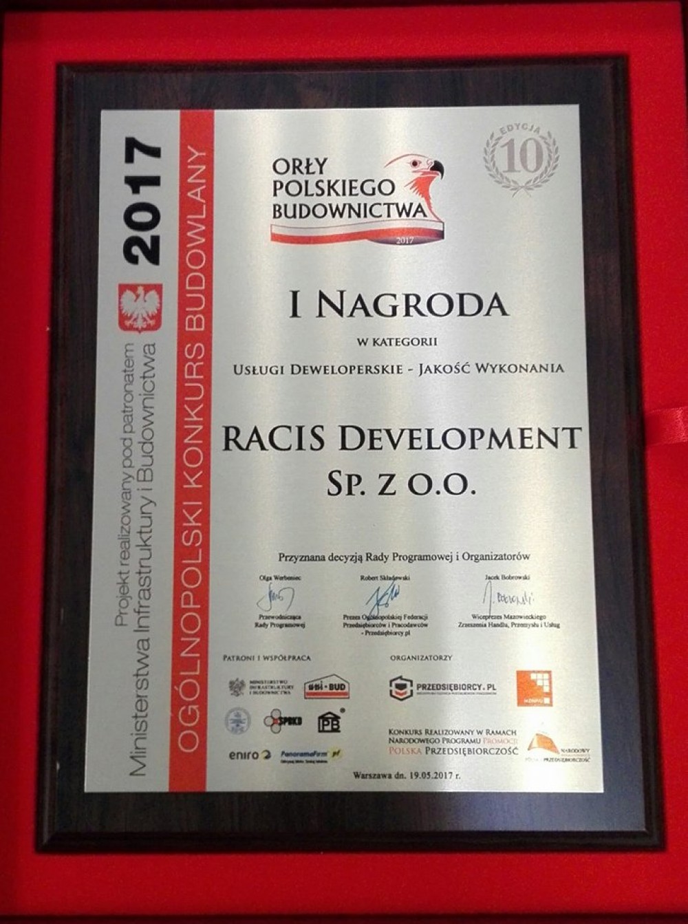 Dotychczas jakość wykonania doceniali klienci. Teraz profesjonalizm firmy Racis Development potwierdziło także jury ogólnopolskiego konkursu „Orły Polskiego Budownictwa”. Suwalski deweloper odebrał podczas Wielkiej Gali w Warszawie Złotego Orła Polskiego Budownictwa, zajmując I miejsce w kategorii “Usługi Deweloperskie - Jakość Wykonania”.