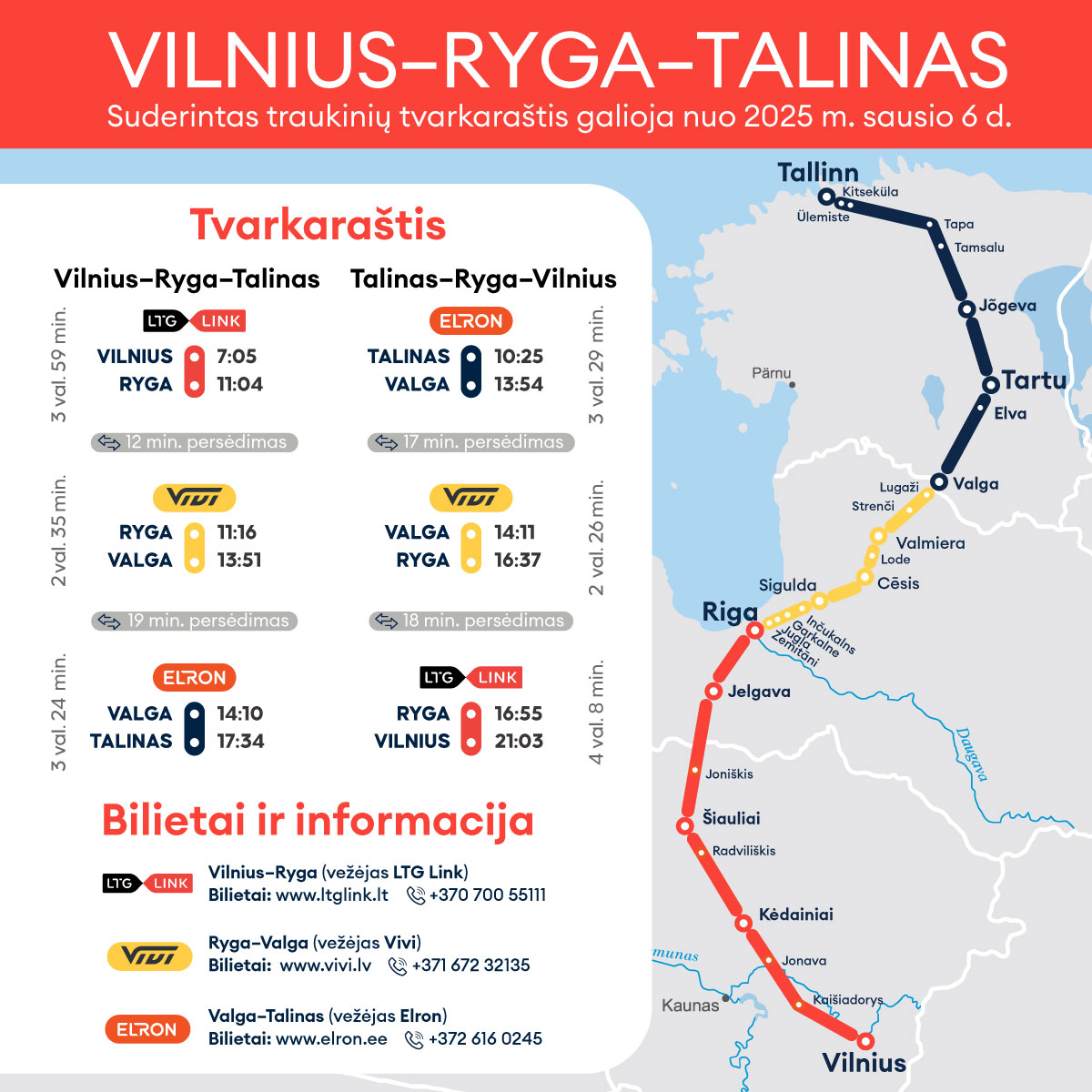 Przewoźnicy trzech krajów bałtyckich – LTG Link, Vivi i Elron – skoordynowali rozkłady jazdy pociągów, aby zapewnić połączenia kolejowe pomiędzy trzema stolicami. Do tej pory nie można było w ciągu jednego dnia dojechać pociągami z Wilna do Tallina. 6 stycznia „Elron” dostosował dodatkowy pociąg Tallinn - Valga - Tallinn, dzięki czemu powstało w pełni funkcjonujące codzienne połączenie kolejowe pomiędzy Wilnem, Rygą i Tallinem.
