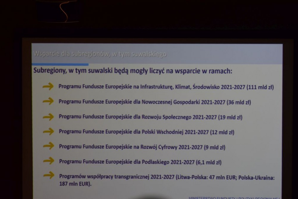 Szerzej mówiÅ‚ o tym Artur Kosicki, marszaÅ‚ek Województwa Podlaskiego, który wymieniÅ‚, że Å›rodki bÄ™dÄ… przekazane na przedsiÄ™biorczość, kulturÄ™, zielonÄ… energiÄ™, a także Miejski Obszar Funkcjonalny, który stworzÄ… Miasto i Gmina SuwaÅ‚ki. Na te ostatnie dziaÅ‚anie przeznczone bÄ™dzie ponad 20 mln Euro. – Mamy też inwestycje strategiczne dla SuwaÅ‚k jak Mediateka w SuwaÅ‚kach i rozbudowa lotniska – mówiÅ‚ Artur Kosicki.