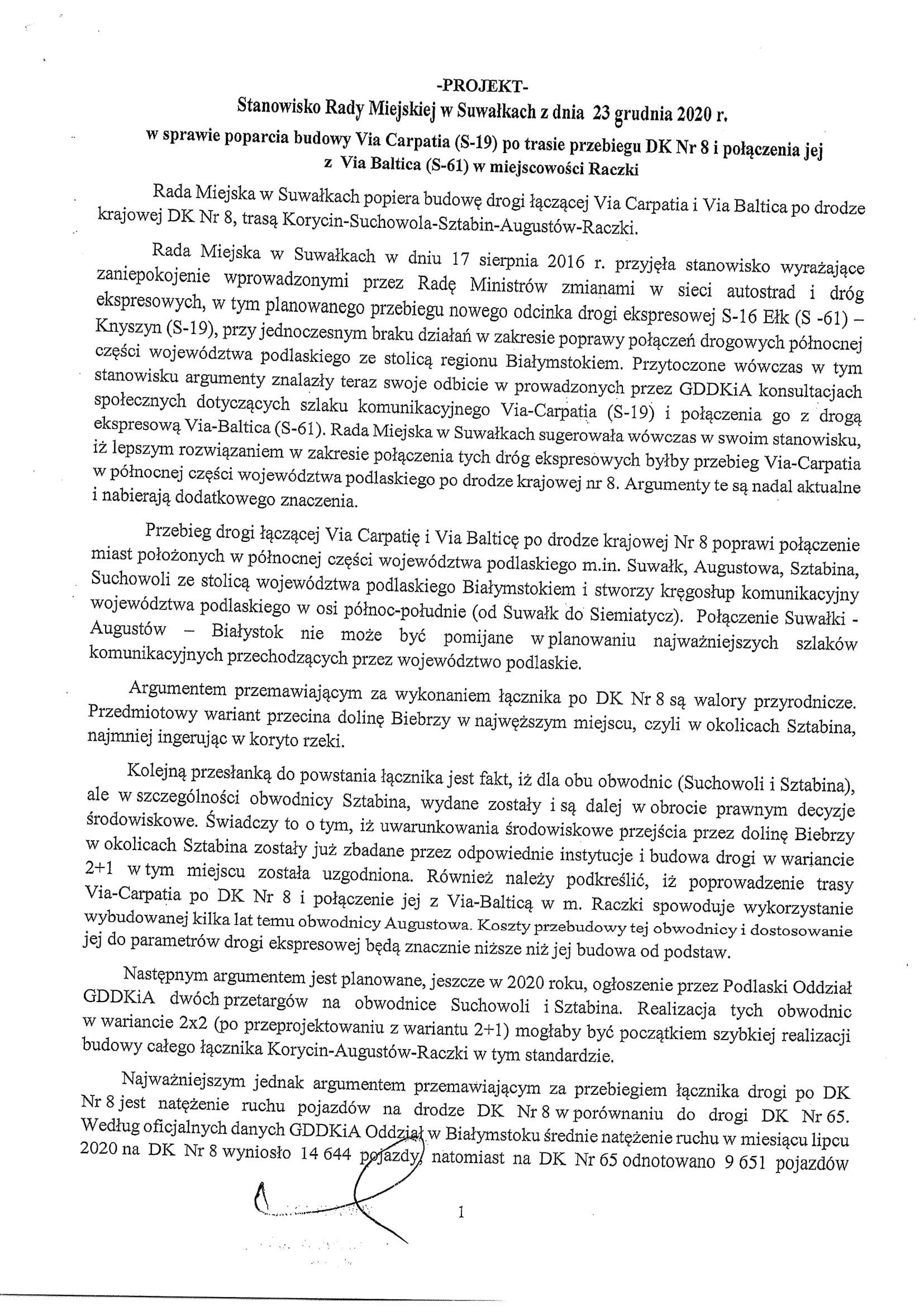 Suwalscy radni jednogłośnie przyjęli w środę, 23 grudnia stanowisko w sprawie poparcia budowy drogi Via Carpatia (S-19) po trasie przebiegu DK Nr 8 i połączenia jej z Via Baltiką (S-61) w Raczkach