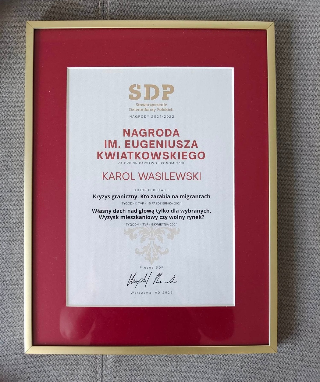 Suwalczanin został nagrodzony za dwie publikacje w Tygodniku TVP: „Własny dach nad głową tylko dla wybranych. Wyzysk mieszkaniowy czy wolny rynek?” oraz „Kryzys graniczny. Kto zarabia na migrantach