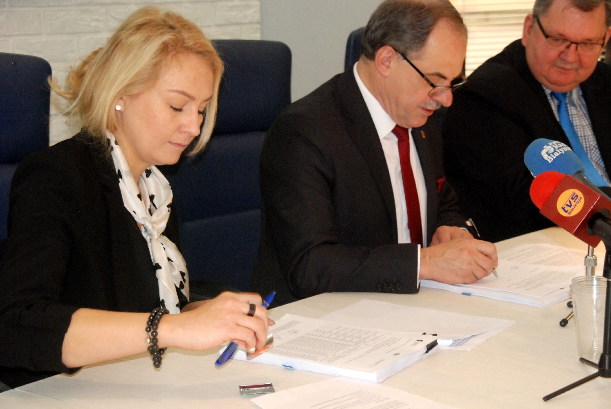 Umowy na dofinansowanie projektu „Suwalskie Centra Kompetencji Zawodowej – kompleksowy model modernizacji systemu ksztaÅ‚cenia zawodowego na terenie Miasta SuwaÅ‚ki”, podpisali dziÅ› w UrzÄ™dzie Miejskim w SuwaÅ‚kach Anna Naszkiewicz, WicemarszaÅ‚ek Województwa Podlaskiego, CzesÅ‚aw Renkiewicz, Prezydent Miasta i WiesÅ‚aw Stelmach, Skarbnik Miasta.