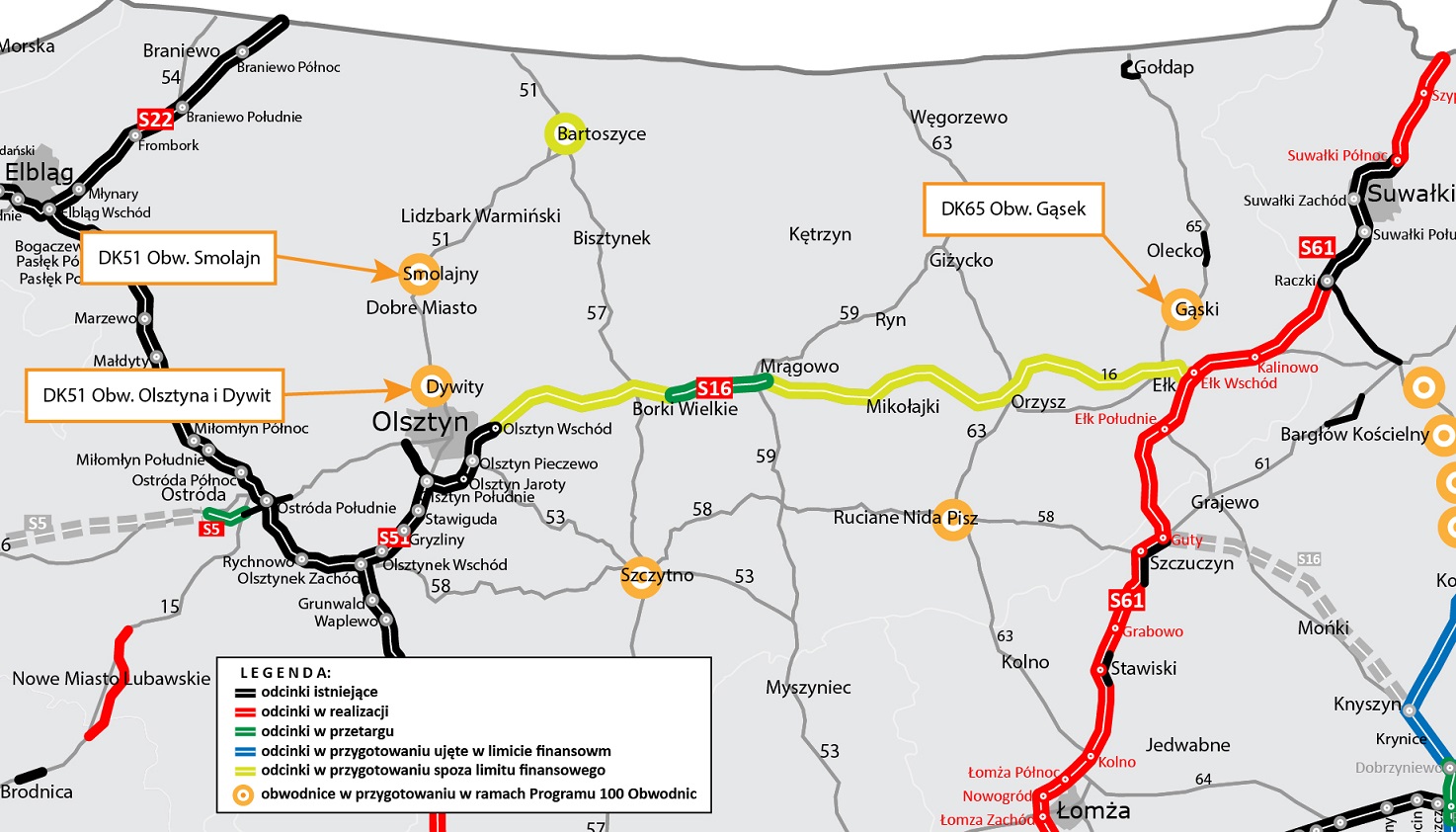 Obwodnica Olsztyna i Dywit o dÅ‚ugoÅ›ci 20 km bÄ™dzie stanowiÅ‚a póÅ‚nocno-wschodnie lub póÅ‚nocno-zachodnie obejÅ›cie aglomeracji olsztyÅ„skiej, w zależnoÅ›ci od wariantu przebiegu, który zostanie wybrany. Droga zostaÅ‚a zaplanowana w nowym Å›ladzie i bÄ™dzie uzupeÅ‚nieniem ukÅ‚adu komunikacyjnego stworzonego dziÄ™ki realizacji obwodnicy poÅ‚udniowej miasta w ciÄ…gu drogi ekspresowej S16 i S51. Obwodnica Olsztyna i Dywit to nowa inwestycja, dla której rozpocznie siÄ™ proces przygotowawczy. Uzyskanie decyzji Å›rodowiskowej jest planowane w II poÅ‚owie 2023 r., natomiast ogÅ‚oszenie przetargu na wybór wykonawcy zaplanowano na 2025 r.