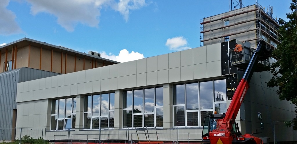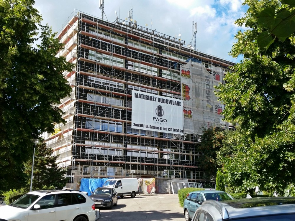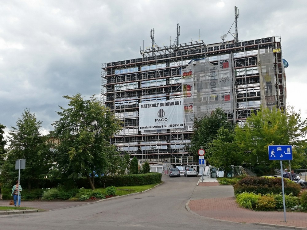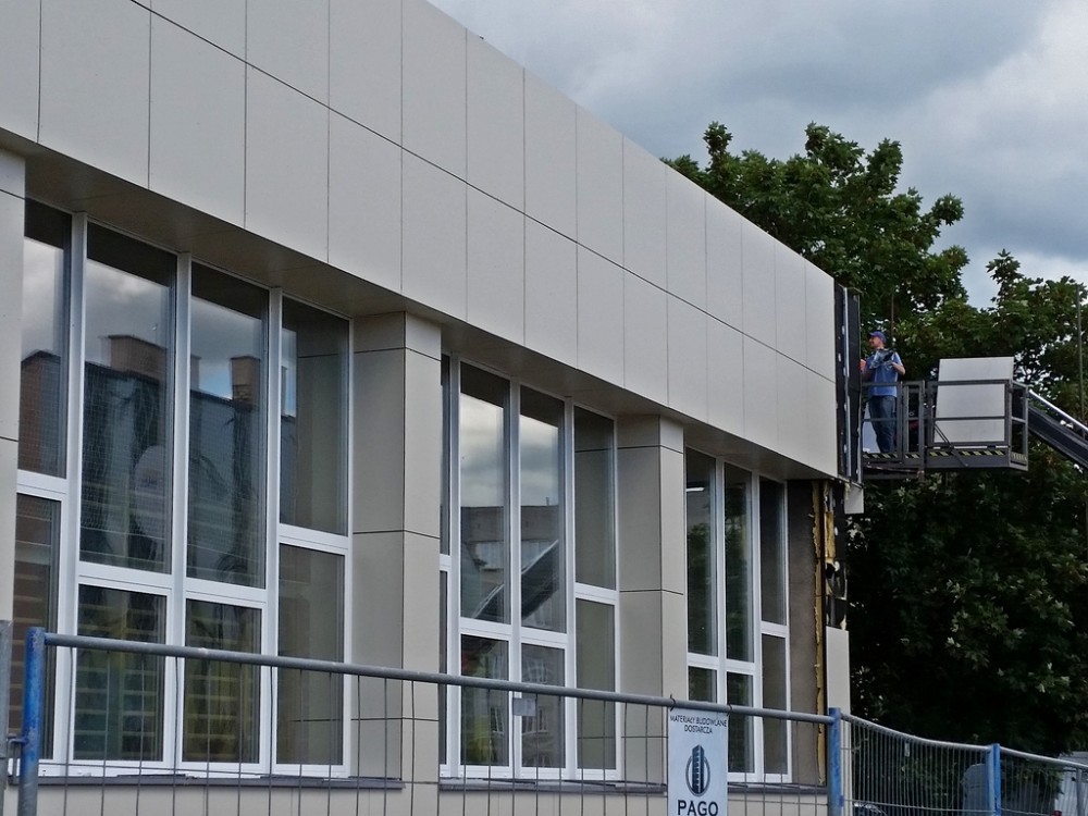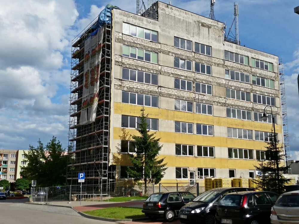 Charakterystyczny szeÅ›ciopiÄ™trowy budynek przy ul. Noniewicza, który wybudowano w 1980 r. na siedzibÄ™ Komitetu Wojewódzkiego Polskiej Zjednoczonej Partii Robotniczej, pokryjÄ… pÅ‚yty w odcieniach szaroÅ›ci. Pierwsze zaczęły być montowane na budynku hali sportowej. WczeÅ›niej caÅ‚y obiekt zostaÅ‚ docieplony warstwÄ… weÅ‚ny mineralnej.