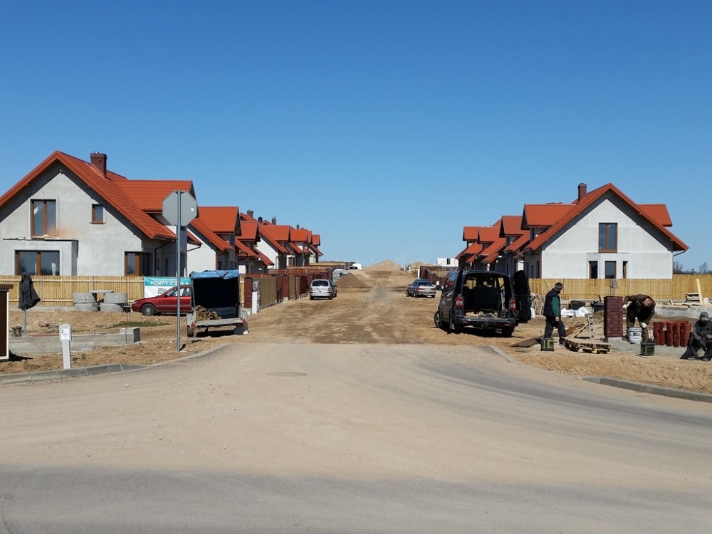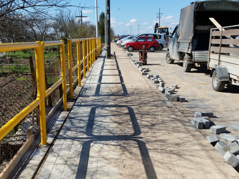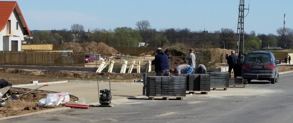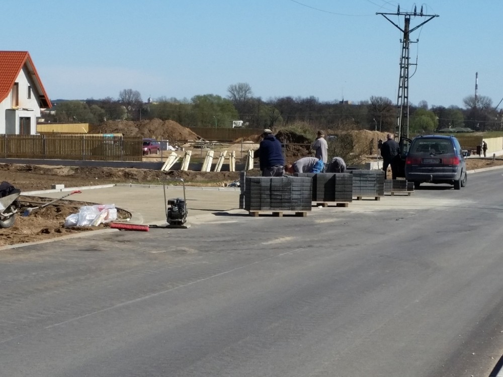 TrwajÄ… ostatnie prace wykoÅ„czeniowe na wysokoÅ›ci ogródków dziaÅ‚kowych. Robotnicy pracujÄ… przy ukÅ‚adaniu kostki i krawężników na zatoczkach i chodnikach. Montowane sÄ… również barierki.