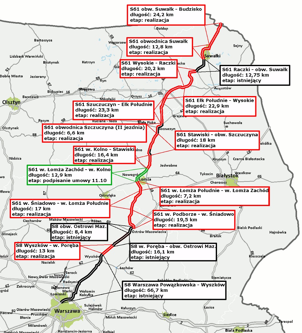 Na terenie województwa podlaskiego w realizacji jest dziewięć odcinków S61 o łącznej długości ok. 134,6 km i wartości kontraktów budowlanych ponad 3,21 mld zł. W województwie warmińsko - mazurskim w realizacji są trzy odcinki o łącznej długości ok. 66,4 km i wartości kontraktów budowlanych 1,87 mld zł.: