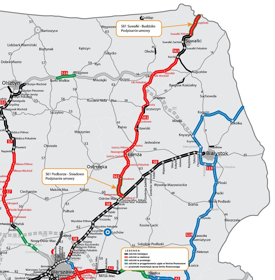 * 39,62 km - podpisane umowy na dokończenie projektowania i budowy (Podborze - Śniadowo, Suwałki - Budzisko).