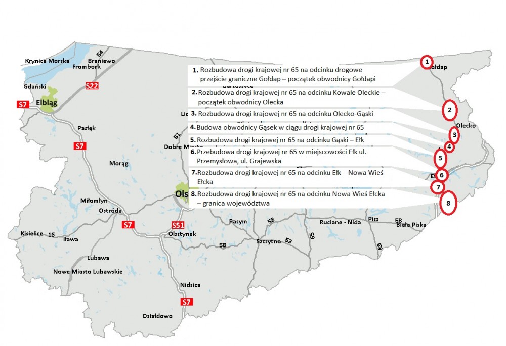 W 2019 r. kontynuowano prace nad wykonaniem projektów budowlanych i wykonawczych wraz z pełnieniem nadzoru GDDKiA autorskiego dla siedmiu odcinków drogi krajowej nr 65 (odcinek Ełk- Gołdap) o łącznej długości 59,1 km oraz nad wykonaniem Studium Techniczno-ekonomiczno-środowiskowego z elementami koncepcji programowej (STEŚ-R) dla zadania pn.: „Budowa obwodnicy miejscowości Gąski w ciągu drogi krajowej nr 65”. Umowa na realizację tych zadań została podpisana 6 lutego 2018 r.