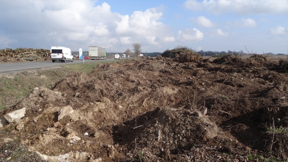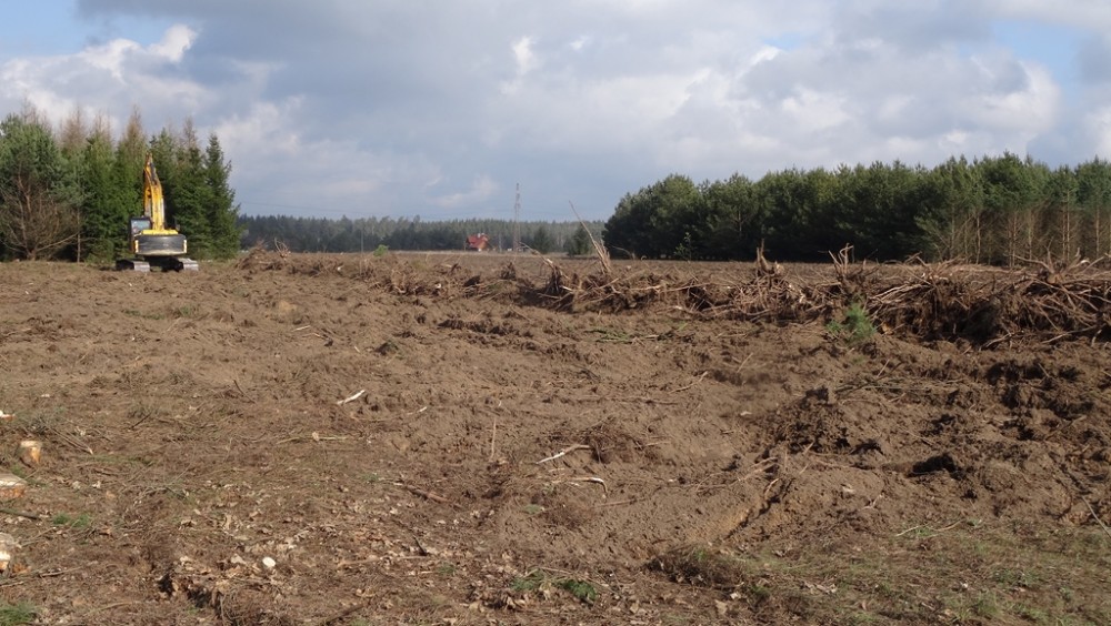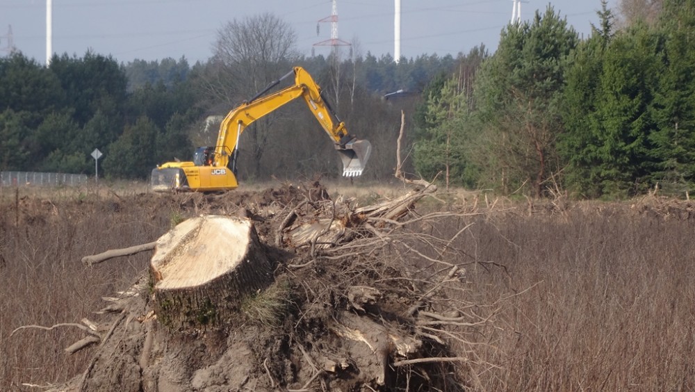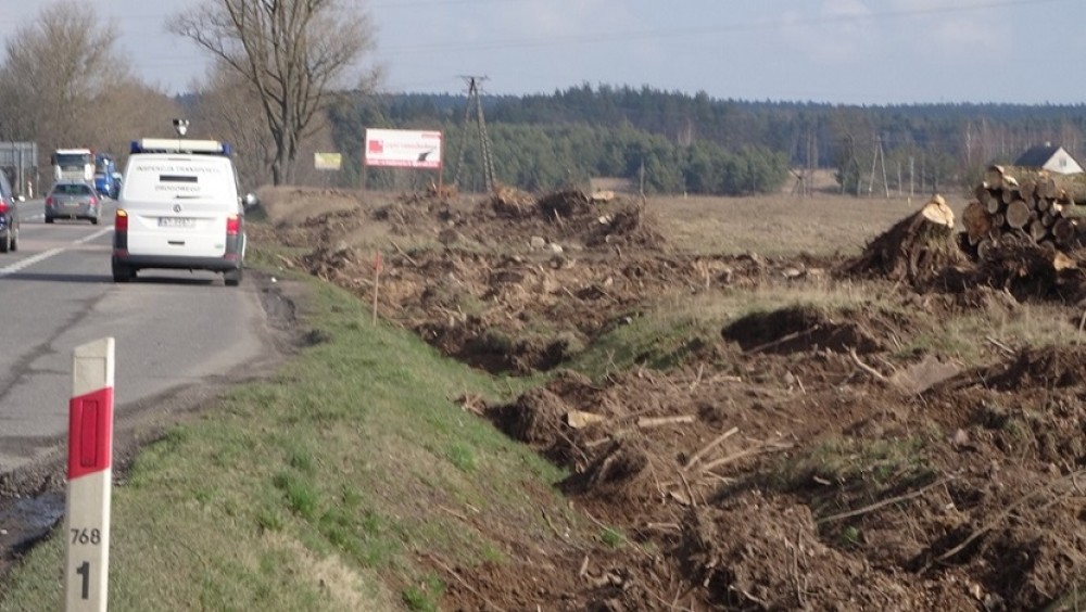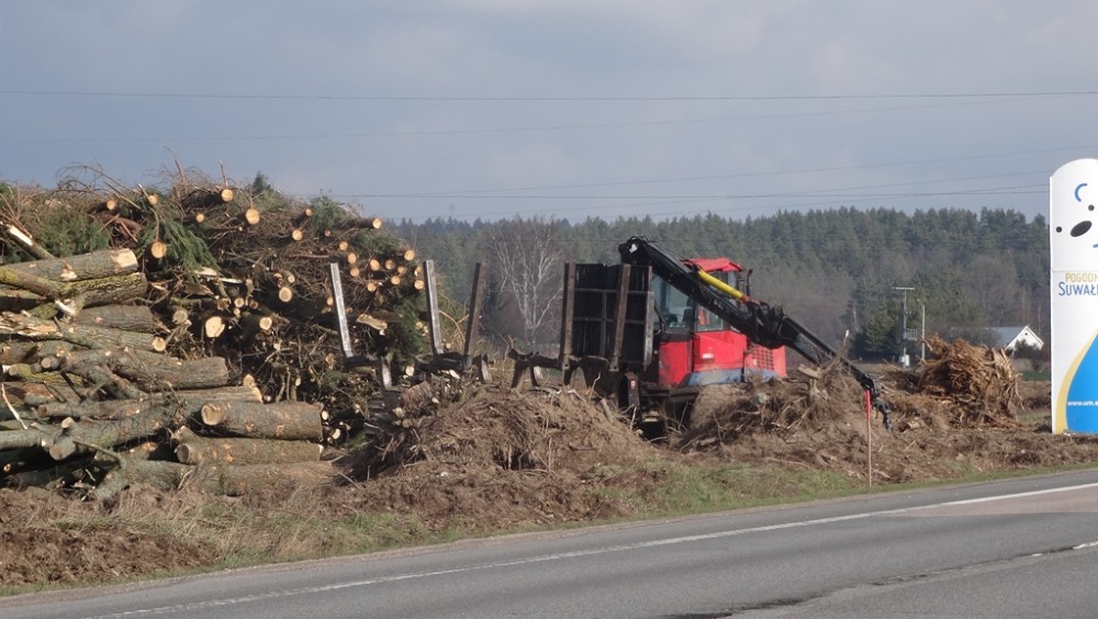 Najpierw wywieziono drewno, a od piątku trwa karczowanie m.in. poboczy oraz działki leśnej od strony ostatniego wiaduktu w Suwałkach i biegnącej obok drogi serwisowej suwalskiej obwodnicy.