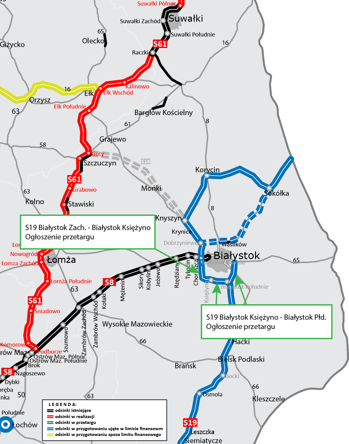 OgÅ‚aszono dwa przetargi. Jeden obejmuje odcinek drogi ekspresowej S19 - od wÄ™zÅ‚a BiaÅ‚ystok Zachód do wÄ™zÅ‚a Księżyno (16,6 km). Drugi odcinek S19 od wÄ™zÅ‚a BiaÅ‚ystok Księżyno do wÄ™zÅ‚a BiaÅ‚ystok PoÅ‚udnie (7,9 km.) z jednoczesnÄ… budowÄ… drogi krajowej nr 65 od wÄ™zÅ‚a BiaÅ‚ystok PoÅ‚udnie do planowanego ronda na obecnej DK65 w rejonie Grabówki (13,6 km) – to wylot z BiaÅ‚egostoku w kierunku Bobrownik (granica z BiaÅ‚orusiÄ…).