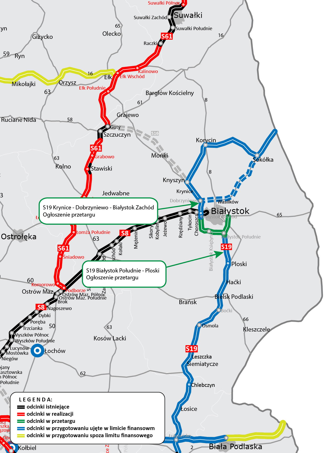 Przed miesiÄ…cem ogÅ‚oszono też przetarg na zaprojektowanie i wybudowanie fragmentu drogi ekspresowej S19 o dÅ‚ugoÅ›ci ok. 24,5 km oraz odcinka drogi krajowej nr 65 o dÅ‚ugość ok. 13,6 km. Obie bÄ™dÄ… tworzyć tzw. PoÅ‚udniowÄ… ObwodnicÄ™ BiaÅ‚egostoku, a odcinki ekspresowe – również fragment korytarza komunikacyjnego Via Carpatia.