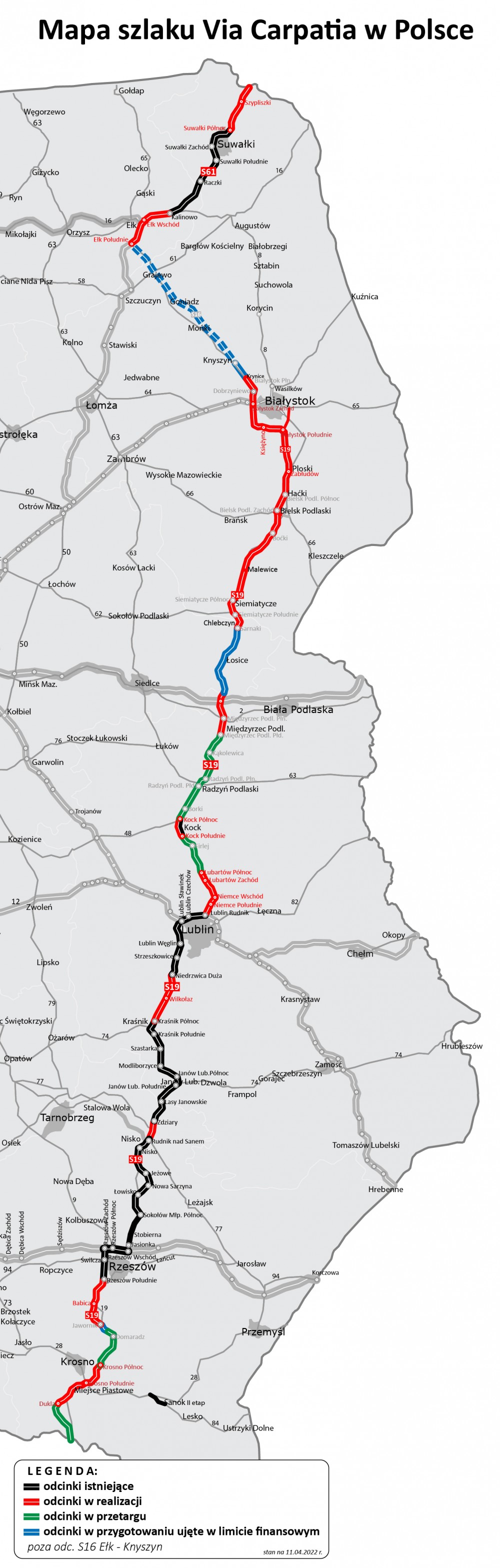 Obecnie szlak Via Carpatia - jest częściowo już dostępny, a częściowo realizowany i projektowany - liczy kilka tysięcy kilometrów. Jest to kluczowy korytarz transportowy łączący Europę Północną i Południową. Via Carpatia na terenie Polski to trasa, której łączną długość szacuje się na około 700 km. W eksploatacji jest nieco ponad 205 km, a w realizacji ponad 280 km.