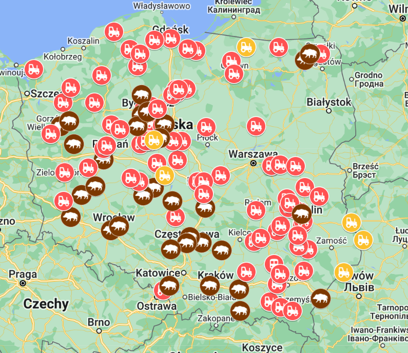 Środowy strajk może być rekordowy, ponieważ rolnicy mają blokować drogi w ponad 270 lokalizacjach (mapa niżej). Wybierając się w dalszą drogę warto postarać się omijać te miejsca.