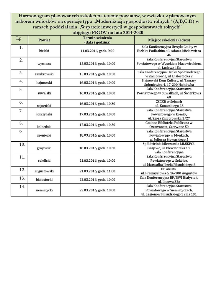 W załączniku harmonogram szkoleń (dostępny także na stronie Agencji: www.arimr.gov.pl w zakładce O ARiMR/oddziały regionalne/podlaski)