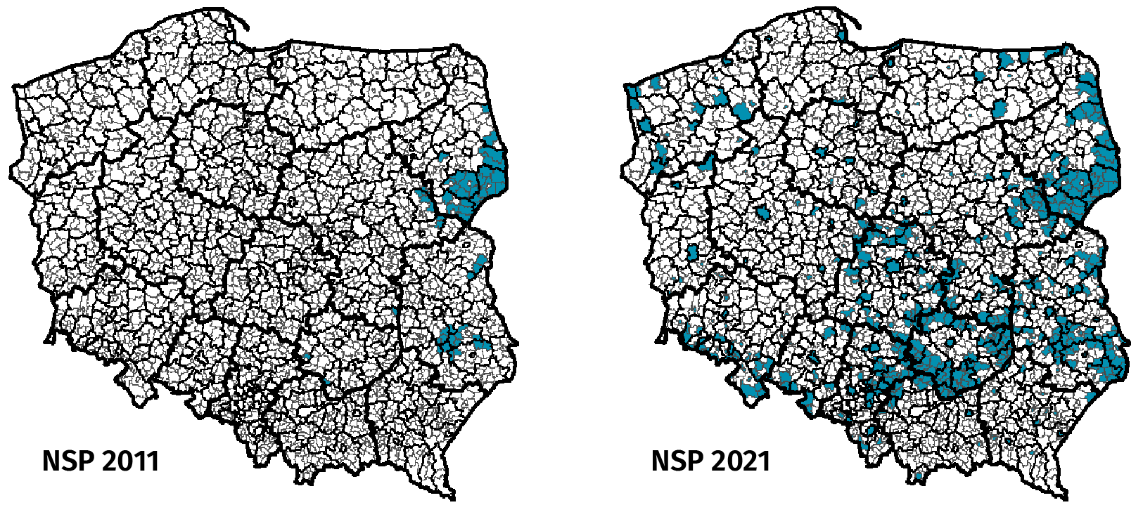 SpoÅ›ród 2 477 gmin funkcjonujÄ…cych w Polsce w 2021 roku spadek liczby ludnoÅ›ci w stosunku do wyników NSP 2011 miaÅ‚ miejsce w 1 776 gminach, w tym w 1 181 gminach ubytek ludnoÅ›ci wyniósÅ‚ powyżej 5%, a w 397 powyżej 10%.