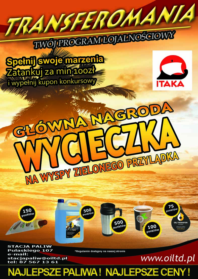 Dwuosobową wycieczkę na Wyspy Zielonego Przylądka wygrać może każdy, kto na stacji paliw Oil Transfer Development zatankuje za co najmniej 100 złotych. Każdy zakup paliwa to dodatkowa szansa. Szczęśliwca, który ferie zimowe na spędzi słonecznej plaży poznamy w czasie grudniowego Mikołajkowego Turnieju Piłki Nożnej.