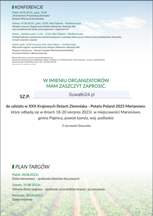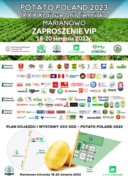 Sekretarz Stanu Lech Kołakowski serdecznie zaprasza na XXX Krajowe Dni Ziemniaka – Potato Poland 2023, które odbędą się w dniach 18-20 sierpnia 2023 r. w Marianowie koło Łomży. W programie m.in. konferencje, festiwal kulinarny, występy artystyczne, atrakcje dla dzieci oraz zabawa taneczna.