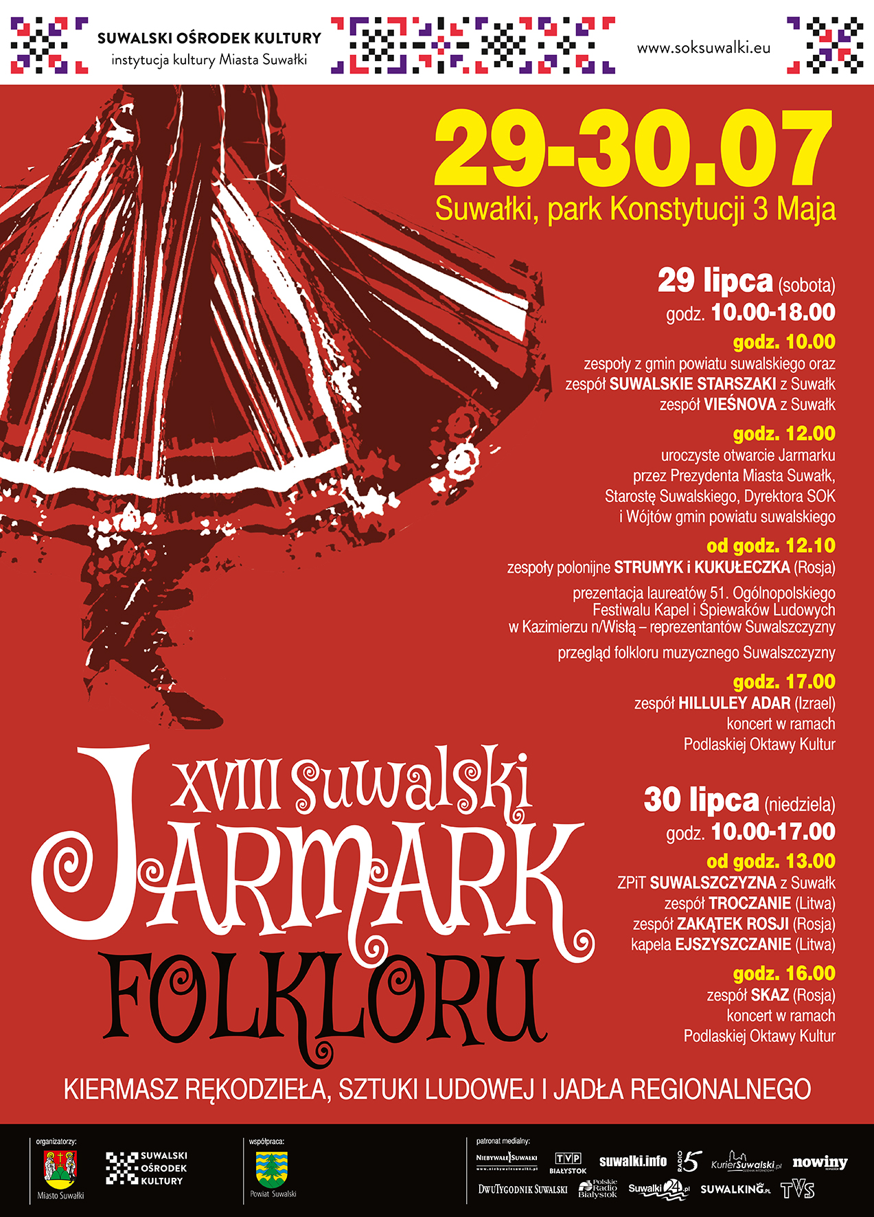 Suwalski Jarmark Folkloru to doskonały pomysł na rodzinne spędzenie wakacyjnego weekendu. Jak co roku nie zabraknie ludowej sztuki, rękodzieła oraz przysmaków regionalnej kuchni. Podziwianie i smakowanie wyrobów właściwych Suwalszczyźnie urozmaici przegląd folkloru ludowego Suwalszczyzny, w tym prezentacja laureatów 51. Ogólnopolskiego Festiwalu Kapel i Śpiewaków Ludowych w Kazimierzu n/Wisłą – reprezentantów regionu oraz koncerty zagranicznych gości (Litwa, Rosja, Izrael), którzy odwiedzą Suwałki w ramach Podlaskiej Oktawy Kultur.