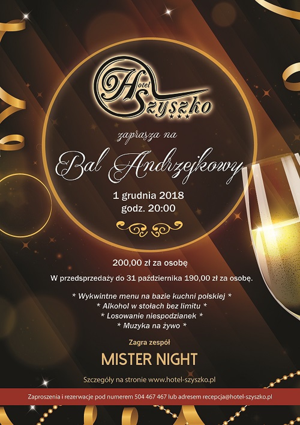 Serdecznie zapraszamy na Bal Andrzejkowy w trzygwiazdkowym Hotelu Szyszko, który odbędzie się 1 grudnia 2018 roku w godzinach 20:00 – 3:00 w Suwałkach, przy ul. Innowacyjnej 3.