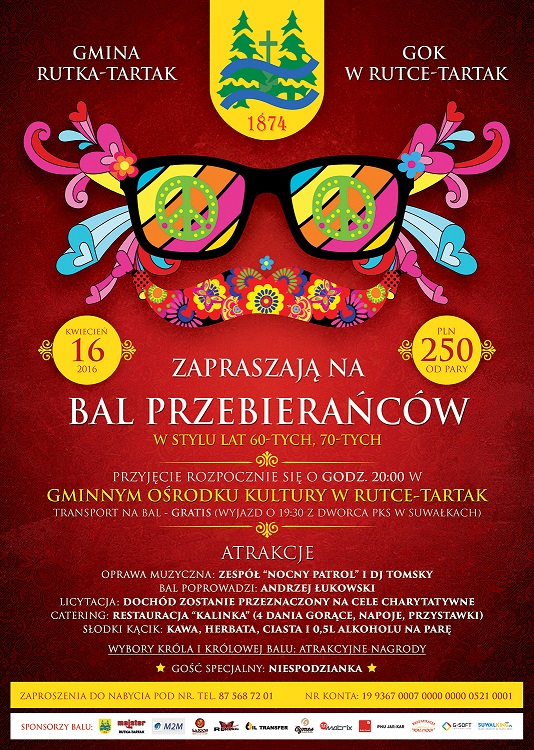 Firma Majster jako sponsor zaprasza w imieniu Gminy Rutka-Tartak i GOK w Rutce-Tartak na Bal Przebierańców w Gminnym Ośrodku Kultury w Rutce-Tartak. Impreza odbędzie się w stylu lat 60- tych i 70-tych. Wstęp 250 zł/para.