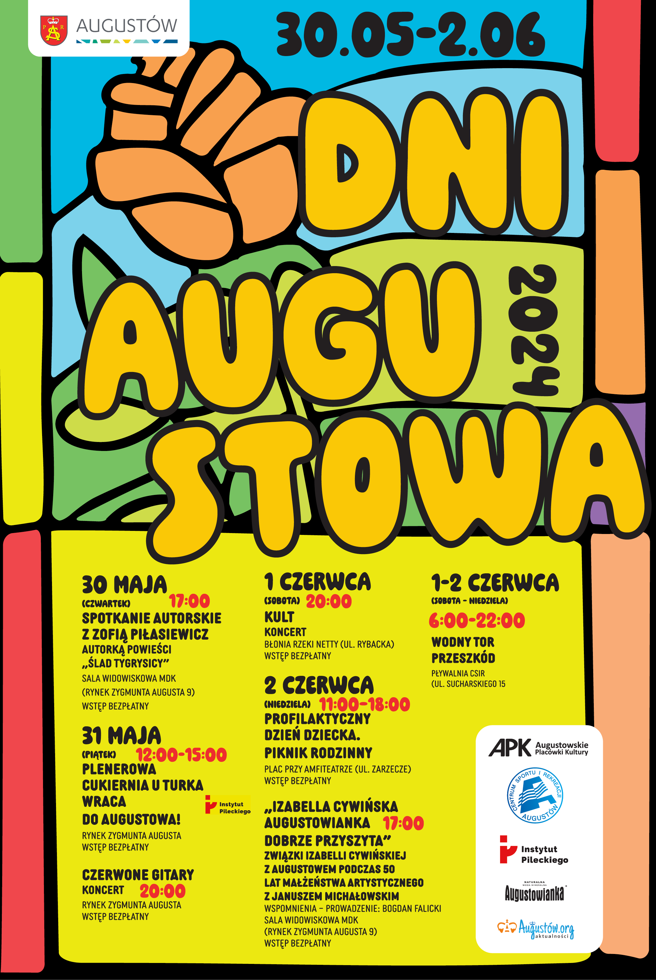Rozpoczniemy w czwartek 30 maja, spotkaniem autorskim z Zofią Piłasiewicz. W programie także koncerty – wystąpią przed Państwem Czerwone Gitary oraz zespół KULT, który wygrał ostatnie głosowanie mieszkańców na muzyczną gwiazdę Dni Augustowa.