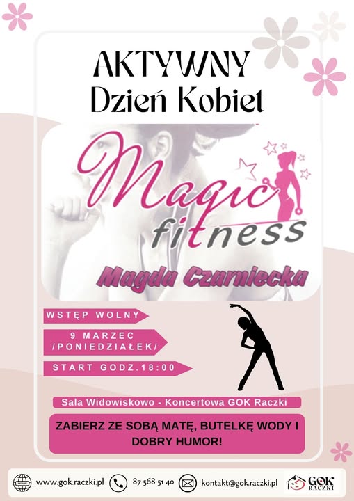 W poniedziałek, 9 marca, z okazji Dnia Kobiet w Gminnym Ośrodku Kultury w Raczkach odbędą się darmowe zajęcia Fitness z Magdaleną Czarniecką.