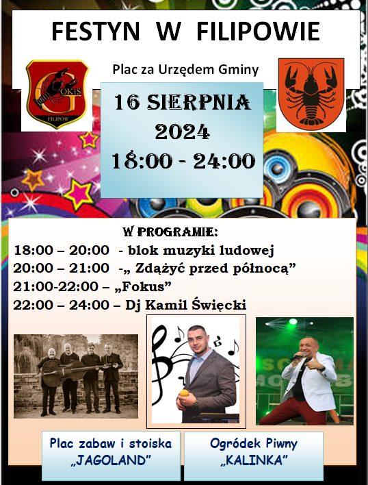Urząd Gminy w Filipowie oraz Gminny Ośrodek Kultury i Sportu zapraszają na Festyn w Filipowie, który odbędzie się w piątek, 16 sierpnia.