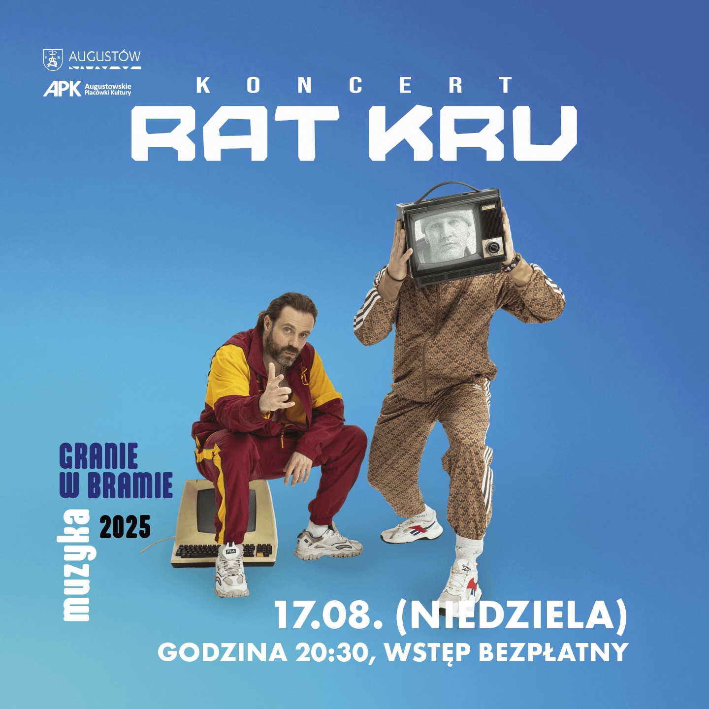 Augustowskie Placówki Kultury serdecznie zapraszają w niedzielę 17 sierpnia 2025r. o godz. 20:30 na kolejne wydarzenie z cyklu Granie w Bramie. Tym razem, w podwórzu* Miejskiego Domu Kultury (Rynek Zygmunta Augusta, wejście od ul. Kościelnej) zagra RAT KRU.