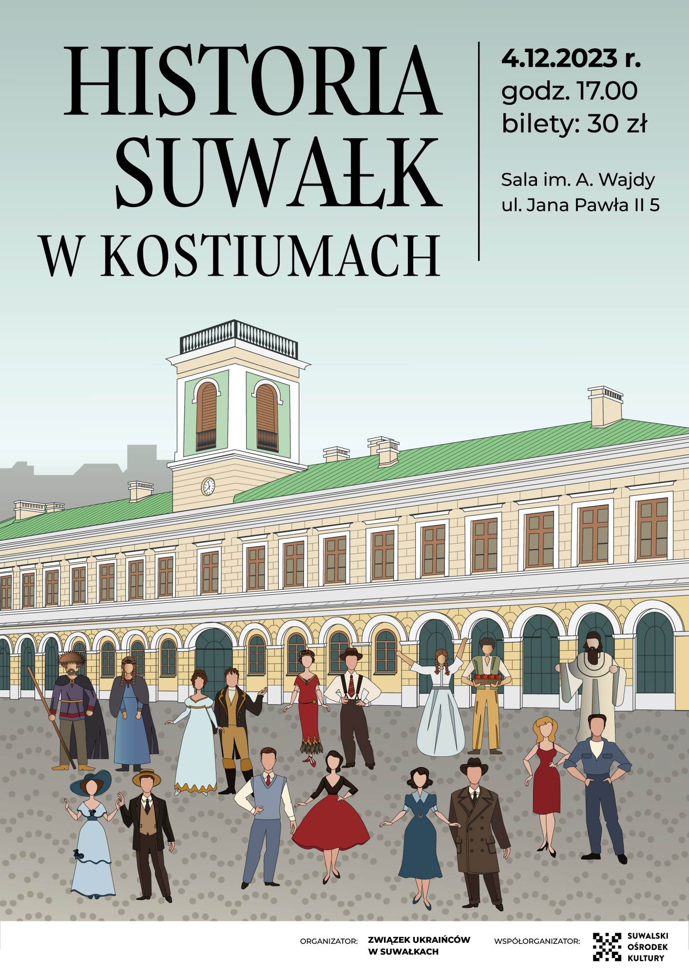 „Historia Suwałk w kostiumach" przenosi widza w czasy prehistoryczne poprzez wszystkie okresy do współczesności. Głównym punktem widowiska będą stroje. Poszczególne scenki pokażą jak poprzez epoki ewaluował kostium z regionu Suwalszczyzny. Jaki był na niego wpływ przyrody, kultury i trendów mody do czasów współczesnych. Barwne widowisko słowno-muzyczno-taneczne wprowadza widza w piękno kultury ubioru Suwalszczyzny a zarazem historię Suwałk.