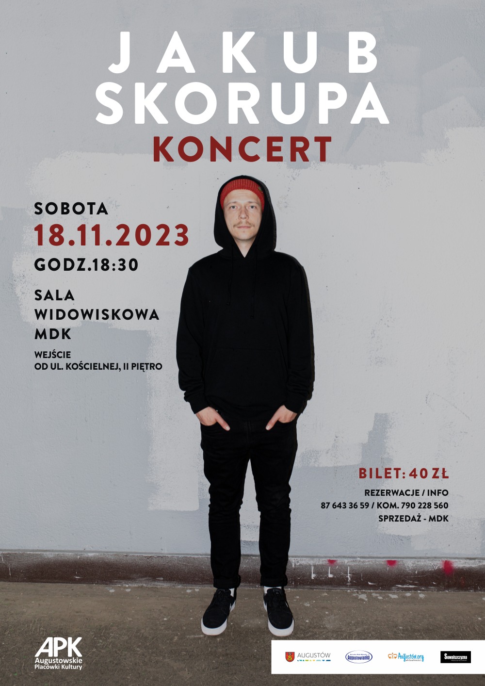 Augustowskie Placówki Kultury serdecznie zapraszają na koncert muzyka uznanego za jedną z nadziei polskiej muzyki. W sobotę 18 listopada 2023 o godz. 18:30 na scenie sali widowiskowej APK (Rynek Zygmunta Augusta 9, wejście od ul. Kościelnej, II piętro) stanie Jakub Skorupa!