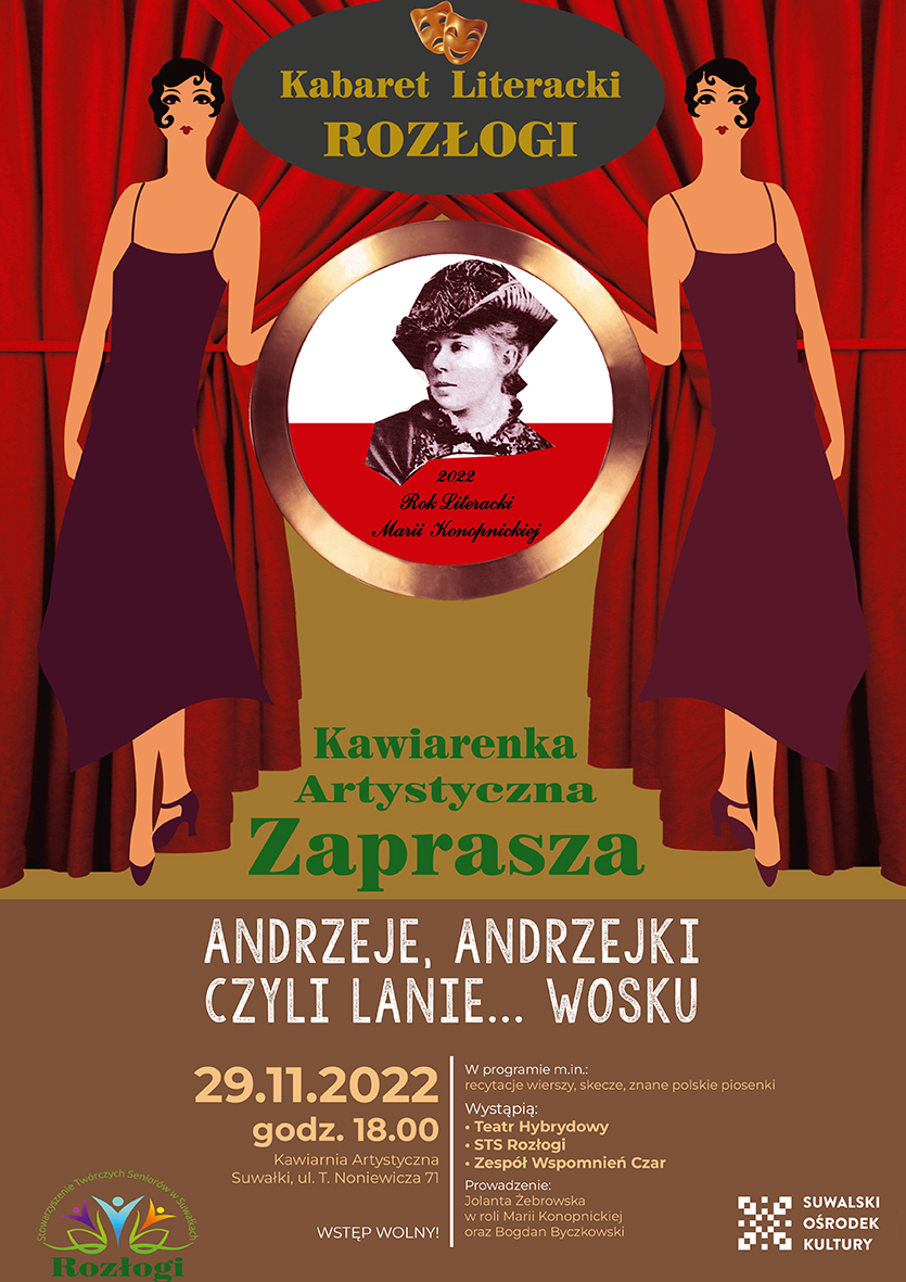 Kabaret Literacki Rozłogi czyli Teatr Hybrydowy i zespół Wspomnień Czar zaprasza na kolejne spotkanie z największą poezją pióra wielkich poetów oraz muzyką najznamienitszych kompozytorów w stylu retro i...nie tylko. W związku z tym, że Andrzejki za pasem, to w ich wigilię troszkę poczarujemy. I znów będzie zabawnie i poważnie, refleksyjnie i dość lekko, bo to przecież kabaret i... Andrzejki.