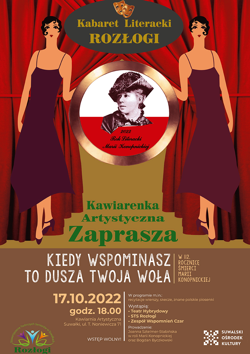 Kabaret Literacki Rozłogi zaprasza na spotkanie z najważniejszymi utworami wielkich poetów oraz muzyką najznamienitszych kompozytorów. W związku z tym, że 8 października mija 112. rocznica śmierci Marii Konopnickiej z Wasiłowskich, a 2022 to Rok Marii więc nie zabraknie twórczości sławnej autorki. Będzie refleksyjnie, lirycznie, poważnie i…też dość lekko, kabaret bowiem rządzi się swoimi prawami. Zatem… nie zabraknie humoru spod pióra Konstantego Ildefonsa Gałczyńskiego.